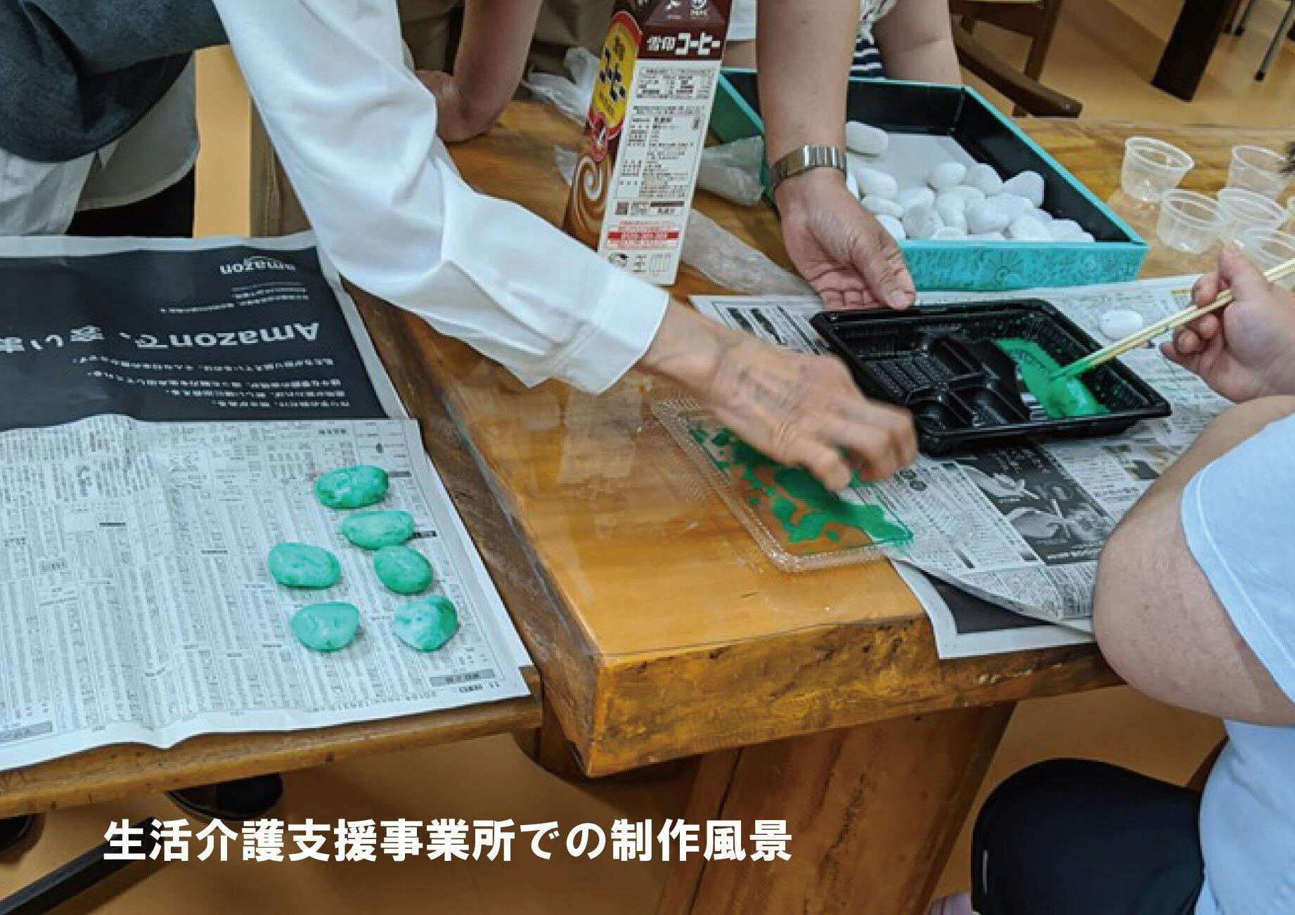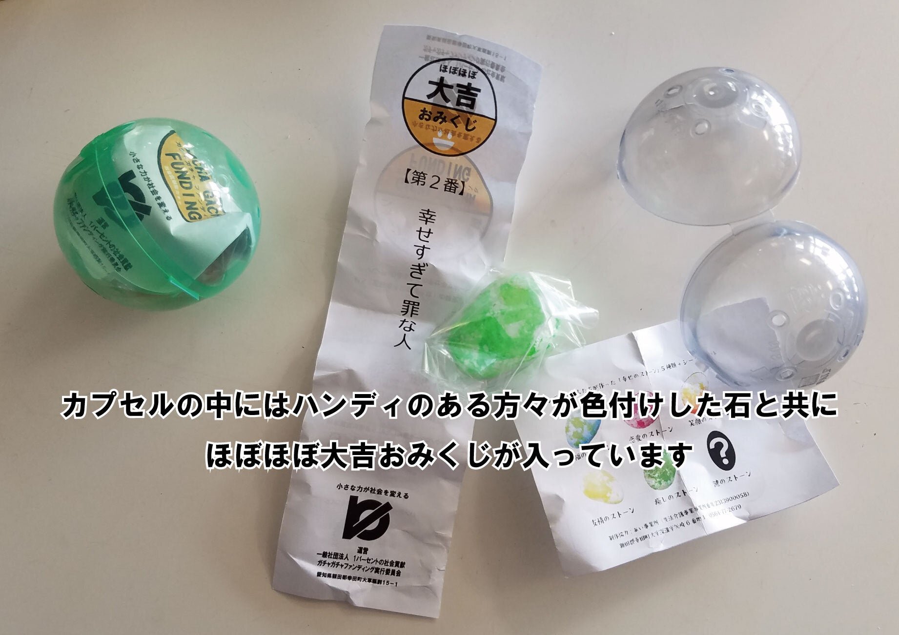 カプセルの中には色付けされた石が入っており、その石は生活介護事業所を利用している知的障がいのある方々に作成していただいています。