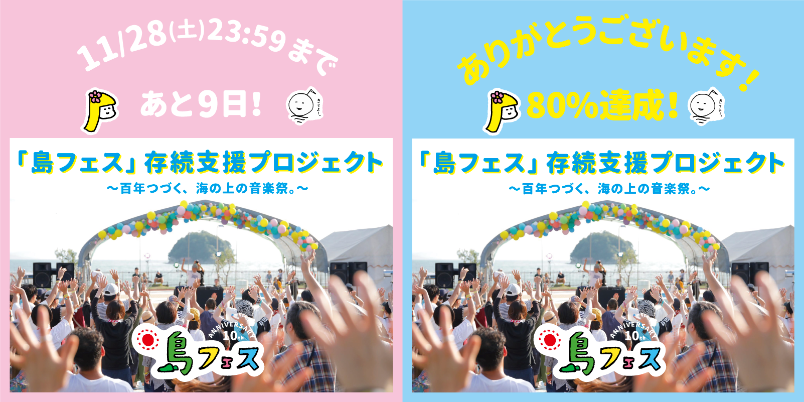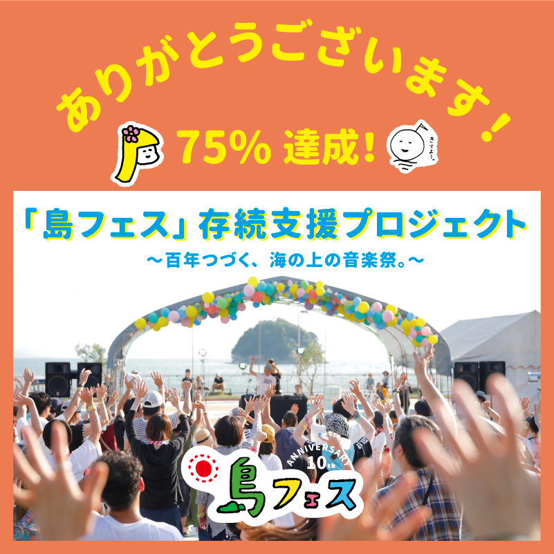 10周年の今年、まさかの開催断念を判断したあの日から…地道に取り組んで参りました、この「島フェス存続支援」クラウドファンディング。締切の11/28(土)23:59まで、いよいよあと11日となりました。現在、目標額の75%を超えて、少しずつゴールが見えて参りました。ぜひとも皆様のご支援、あともうひと押し、どうぞよろしくお願い致します。リターン品も一つ一つ丁寧に手づくりされたものばかり。この10年間で出逢ったアーティスト、出店者、島の方々なども含めたリターン品がてんこ盛りです。島フェスだけでなく、島フェスがこの10年間で出逢った愛すべき方々にも少しでも支援が巡るようなかたちを目指しています。ぜひ、島フェスを通じて、愛すべき方々への支援をお願い申し上げます。(追加リターンで、まるごと応援セットなども追加されております!)そしてそして、参加アーティストの方々から、愛の応援メッセージ映像が続々届いています!島フェス公式YouTubeチャンネル からぜひご覧下さいね!https://youtu.be/be6DCOFx78Y引き続きどうぞどうぞ、よろしくお願い島す。来年開催のため、島フェスからの"一生のお願い"です…!shima fes SETOUCHI実行委員会 スタッフ一同