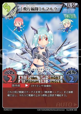 2017/09/26 19:28こんにちは!ひろです! 本日2枚めは「[飛行編隊]ルマルク」のご紹介です! この兵装はHAGMI!シリーズで初めて「トークン(※1)」を利用する兵装カードです。 ステータス自体はコスト2の兵装カード程度なのですが、場に出た時にこの兵装と同じステータスを持ったユニットトークンを2体戦場に出すことができるのです。 そのため、実質的な火力は6点にも上り、燃料あたりの火力量は非常に高いものとなっています! 攻めにも守りにも活躍してくれる、非常に頼もしい兵装カードですね! ちなみに、コピーするのは「戦闘ステータス」だけなので、出てきたトークンがスキルを発動させて無限に増える……なんてことはないのでご安心を! (ちなみに、HAGMI!02には特典としてトークンカードが4枚入ってます) イラスト担当は剣嵜光鋭様でした! それでは、HAGMI!02よろしくお願いします~! (※1 トークンとは、実在しないカードやユニットを表すためのもの。) もっと見る
