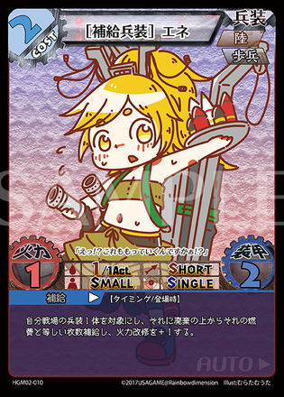 こんにちは、HAGMI!02カードプレビューの時間です! 今回は「[補給兵装]エネ」を紹介いたします。 この兵装は、登場時に他の兵装(勿論自身でも)の燃料を補給しつつ、ついでに良い弾薬で火力も強化してくれるカードです。 燃費分の燃料を補給してくれるので燃料切れの大きな兵装でも1回は行動できますし、火力改修(※第5回)でさらに強力な攻撃を繰り出すことができるのです! HAGMI!ではこういった低いコストのカードのサポートを利用して戦況を有利に運ぶことが大事になる局面も多いでしょう。 所謂コンボというやつですね。 あなたもHAGMI!で面白いコンボを見つけてみませんか? 「HAGMI!02」の発売時点で総カードプールは200種類に上ります。 中には激ヤバなコンボも眠っているかもしれませんが、それを考えるのも楽しいかもしれませんね。 イラストはむらたむうた様。 可愛らしいマスコット的なエネちゃんですが、一緒に運用するカードによってはその顔に見合わない、非常に強力な働きをしてくれることでしょう。 それでは、HAGMI!02、よろしくお願いします~! ひろ