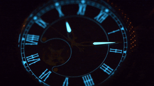 針や文字盤に夜光加工がされている為、暗闇の中で光ります。昼間に太陽の光を吸収し、暗闇の中ではっきりとした青色の光を発します。