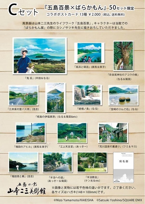 上記は長崎県の五島に2年前に開館した、山本二三美術館のグッズを取り扱っているページです。こちらでは、送料込みで本リターンと同じものを手に入れることができます。さらに、限定の「五島百景×ばらかもん」コラボポストカード13種等、本リターンで取り上げてない素敵な商品もありますよ。