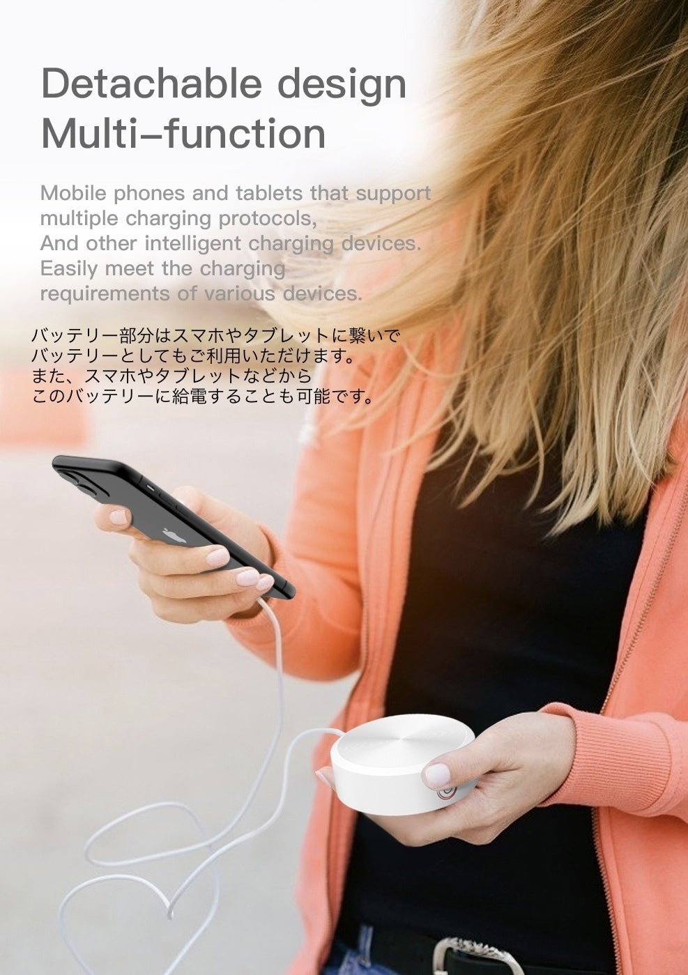 バッテリー部分はスマホやタブレットに繋いでバッテリーとしてもご利用いただけます。また、スマホやタブレットなどからこのバッテリーを給電することも可能です。