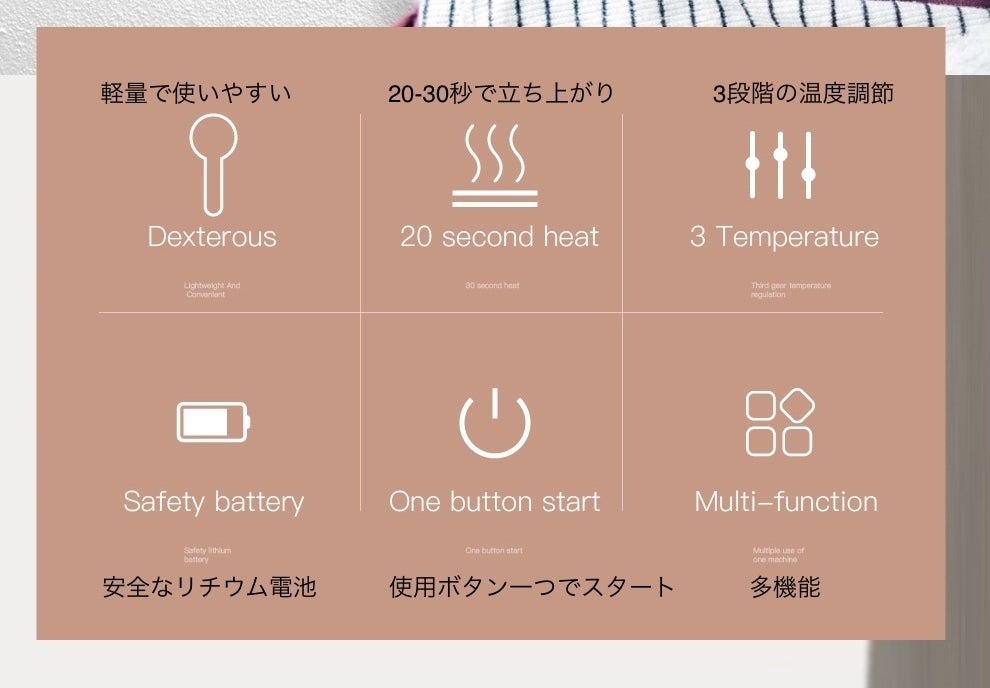 20-30秒で素早く温まり、シワをスムーズに伸ばしてくれます。オーバーヒートの際には自動で電源がオフになります。