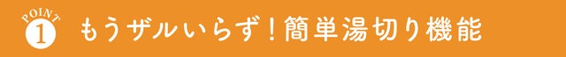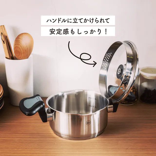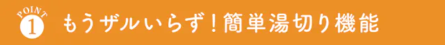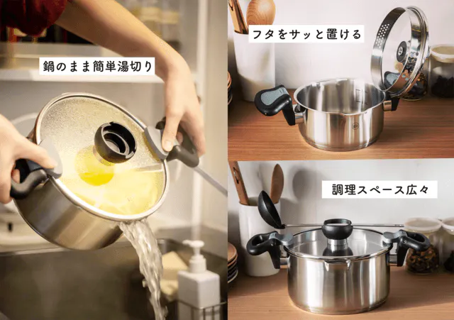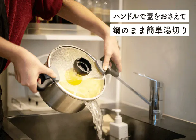 ハンドルで蓋を抑えながら、安全に湯切りをすることができます。
