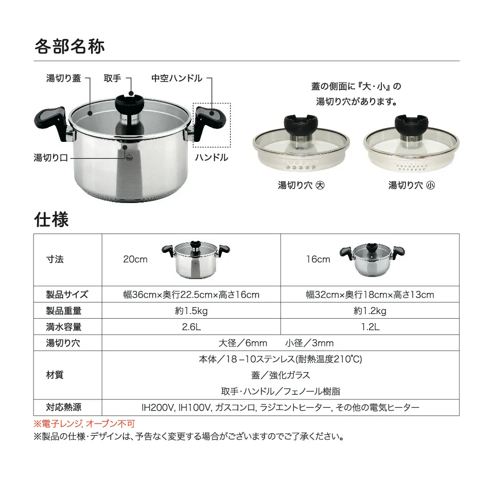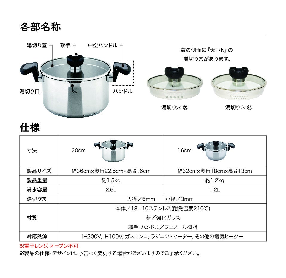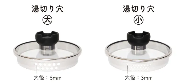 茹でるものに併せて2つの湯切り穴を使い分けることが出来ます。