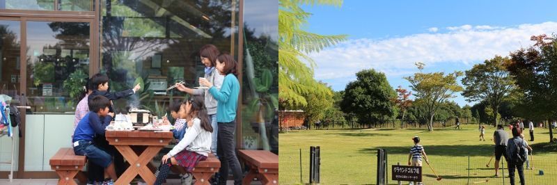 公園センターで家族4人で楽しめる、食材付き手ぶらテラスバーベキューファミリーチケットとテラスバーベキュー場のすぐ隣にあるグランドゴルフ場の利用券4枚です。