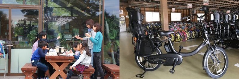 公園センターで家族4人で楽しめる、食材付き手ぶらテラスバーベキューファミリーチケットと公園サイクルセンターで利用できる、子ども乗せ電動アシスト付き自転車利用券1枚です。