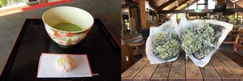 三景園で利用できる抹茶和菓子セットペア引換券と三景園のアジサイドライブーケ引換券です。