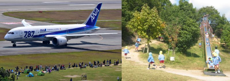 中央森林公園は広島空港のすぐ隣ということで、大きな飛行機を見ることができます。中でもピクニック広場は目の前が滑走路なので飛行機を間近に見ることができ、パイロットに手を振ると振り返してくれることもあります。ピクニック広場には長いローラー滑り台やブランコなどの遊具もありますので、遊びながら飛行機が来るのを待つこともできます。