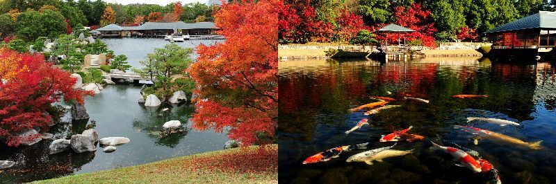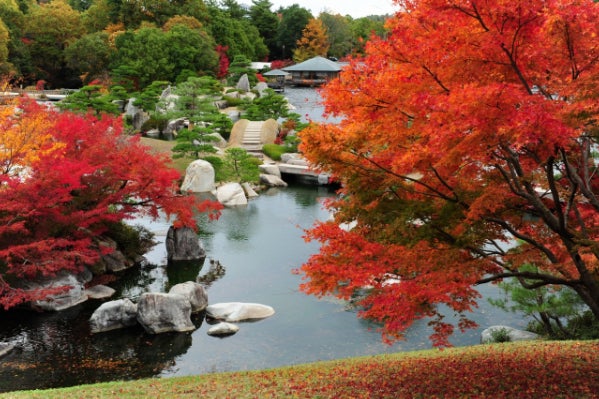 広島の「山」、「里」、「海」の豊かな風景をギュッと凝縮し、四季を通して色々な表情を楽しむことができる三景園、なかでも特に見応えがあるのが紅葉の季節です。ドウダンツツジ、ヤマボウシ、ナツハゼ、ダンコウバイなど、きれいに色づく木々が多く見られますが、なんといっても主役はモミジです。