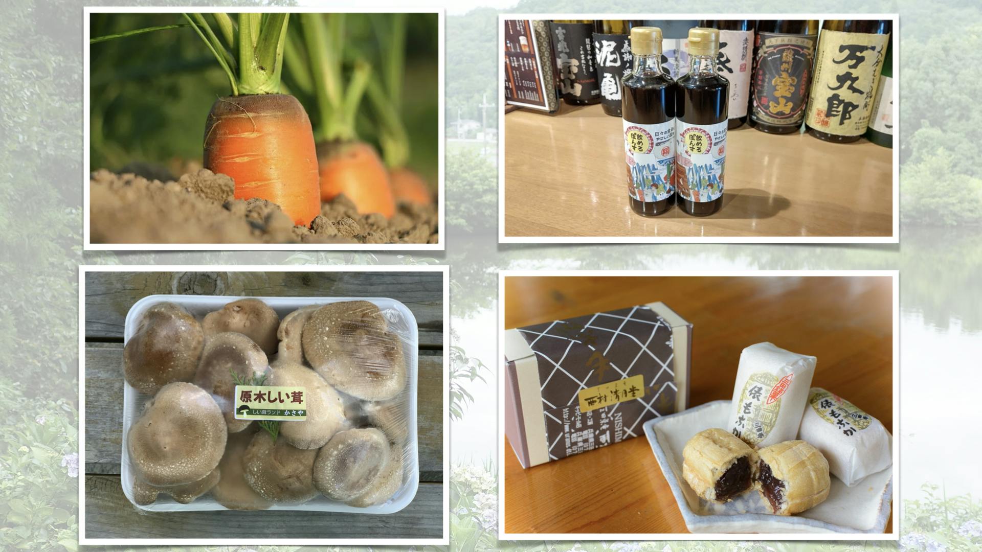 (竹岡農園野菜セット、創作料理翔 特製ポン酢、原木椎茸、 西村清月堂 俵もなか)