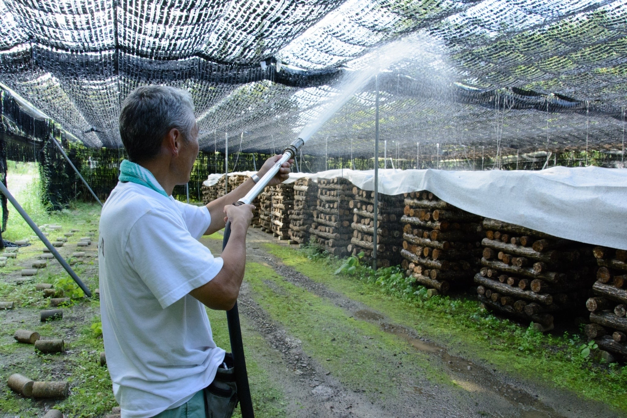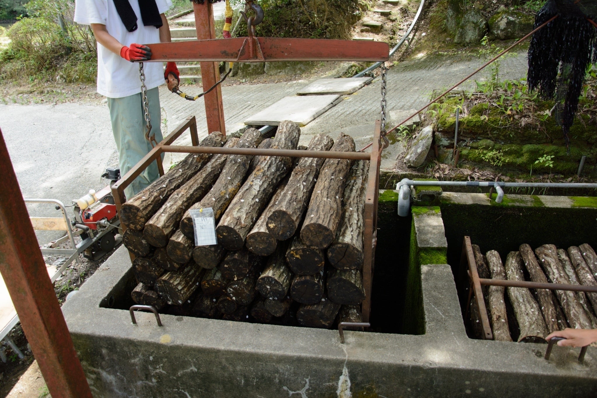 スタッフ総出で見た目よりもかなり重い原木を何度も動かして環境を整えながら丹精込めて作っています。