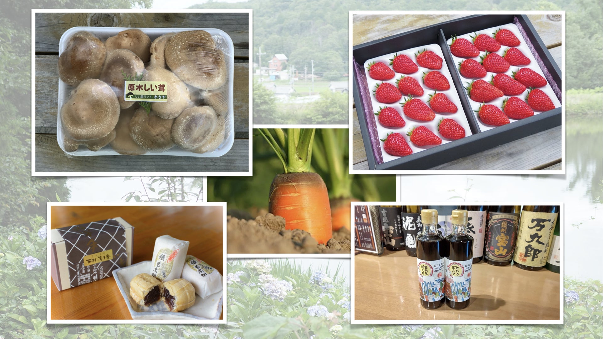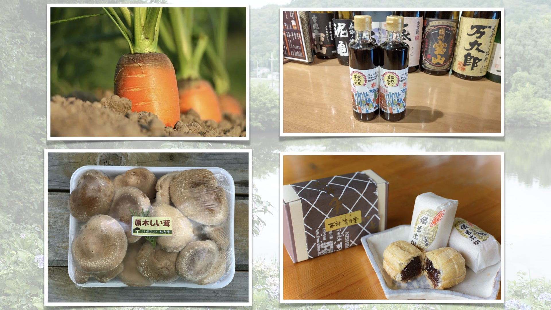 (竹岡農園野菜セット、創作料理翔 特製ポン酢、原木椎茸、 西村清月堂 俵もなか)