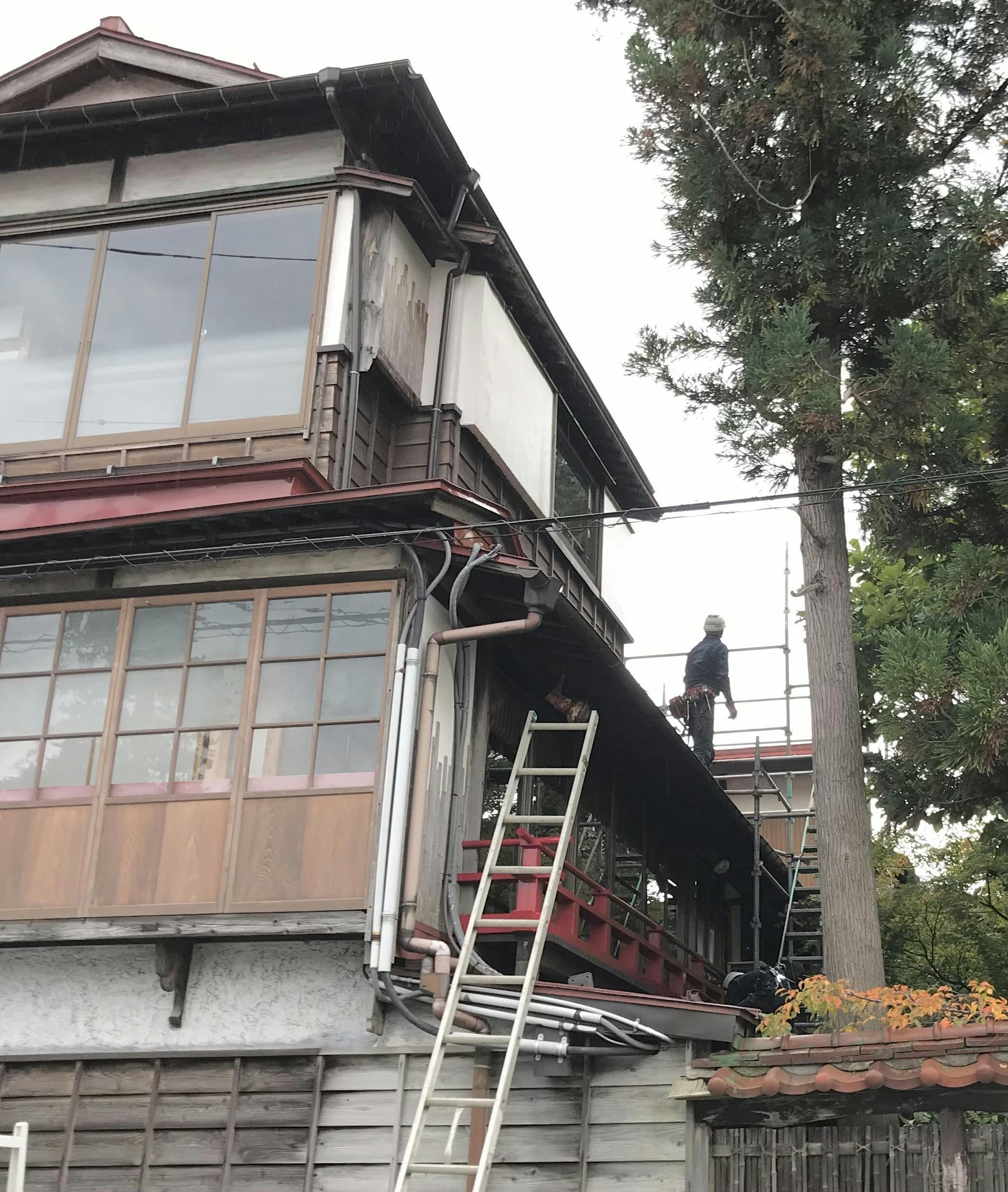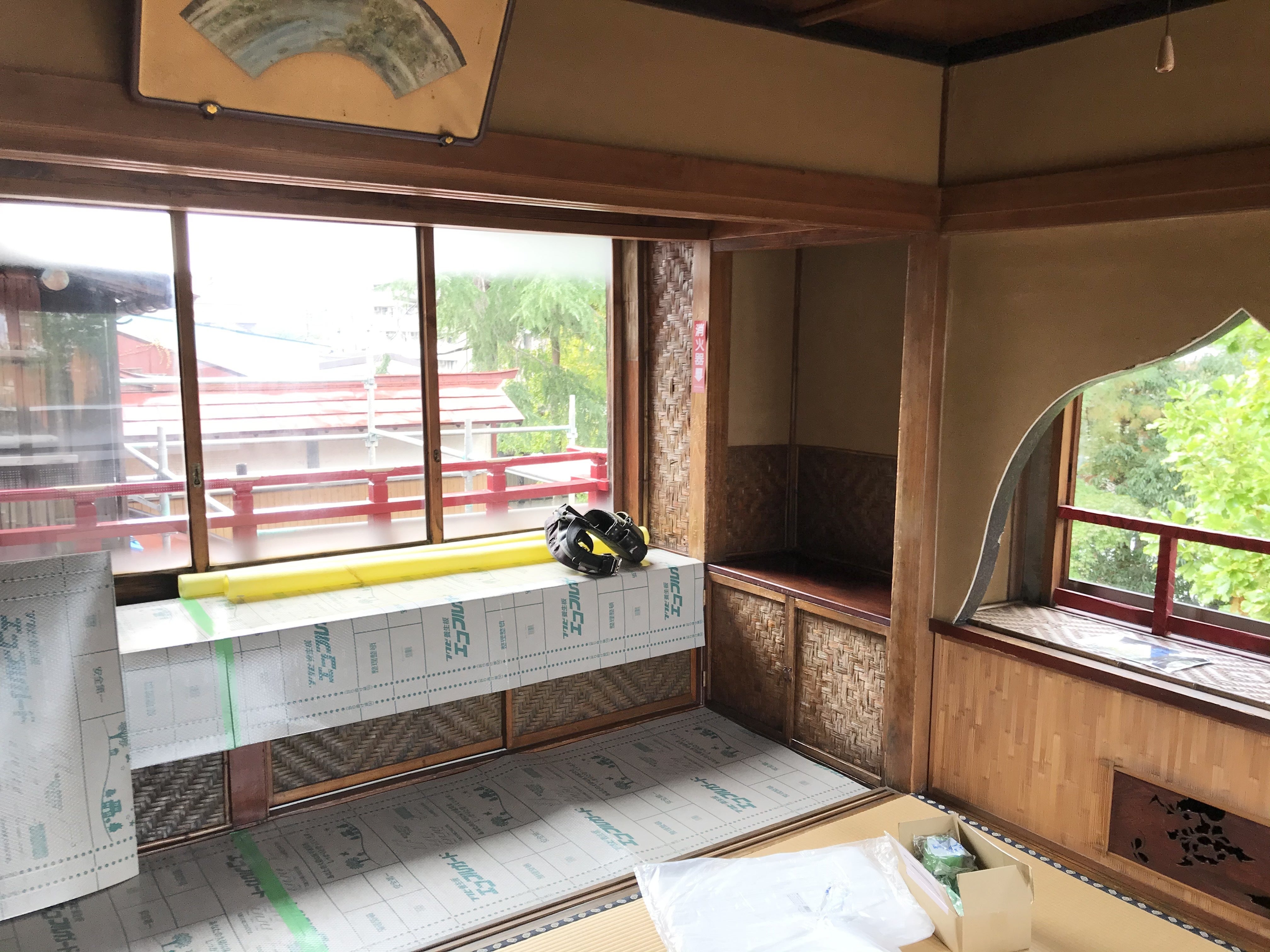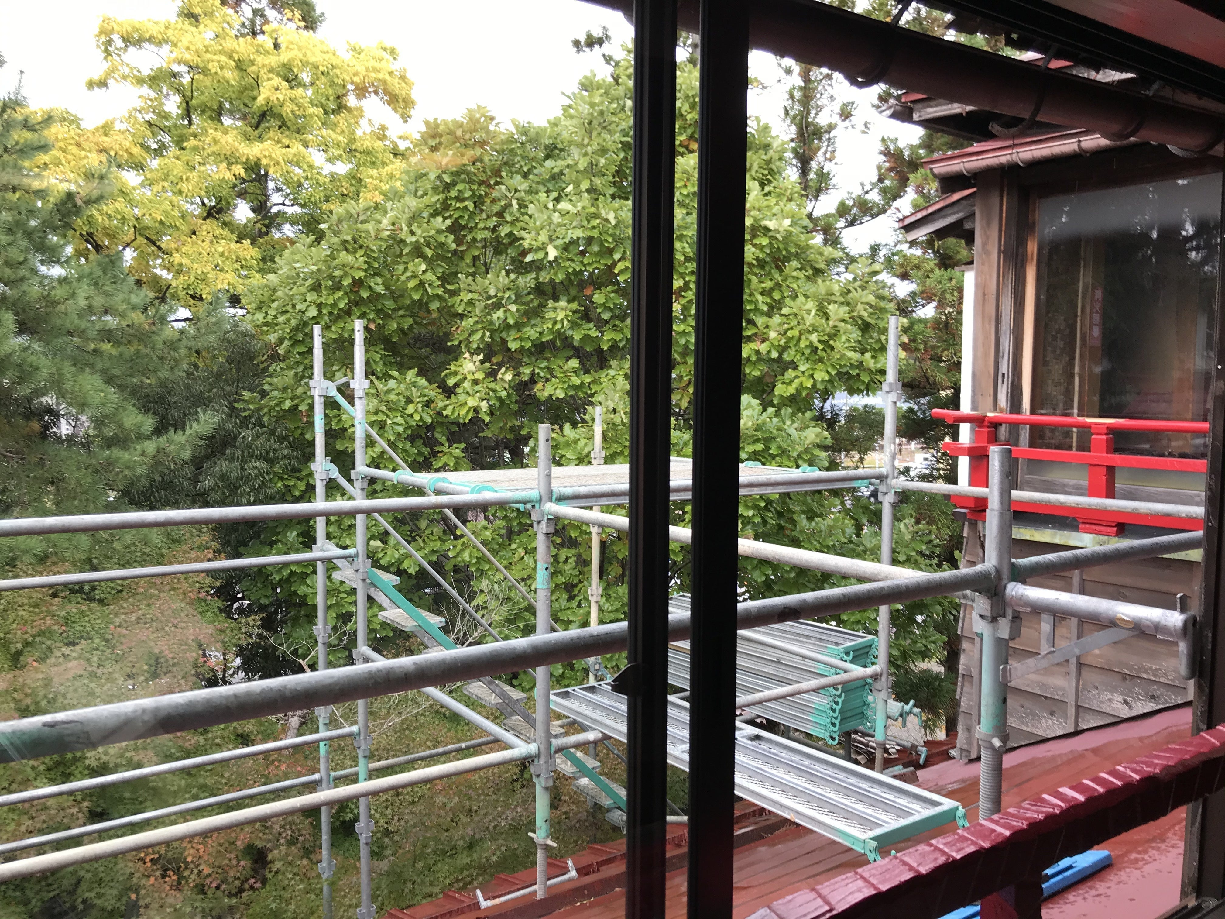 いよいよ改修工事が始まりました。本日は、搬出入のための足場の組み立て作業や養生作業を行い、本格的な工事は4日(水)桜三階と仲三階のトイレ撤去から行う予定です。
