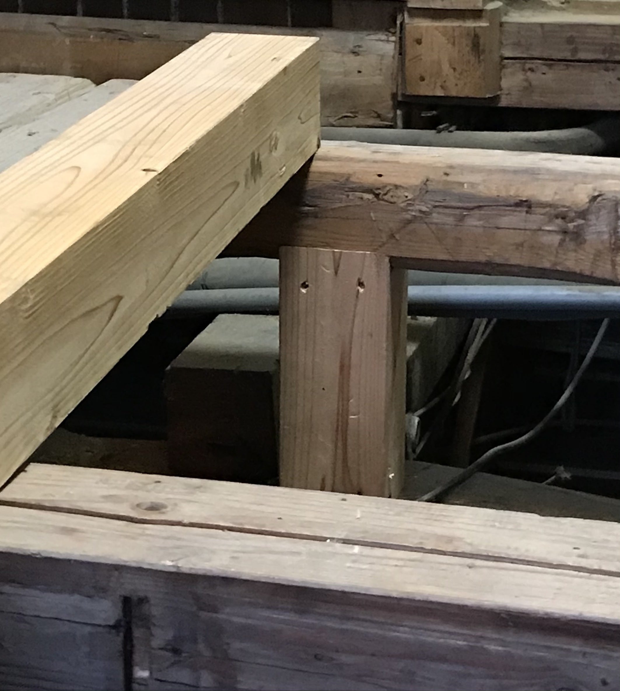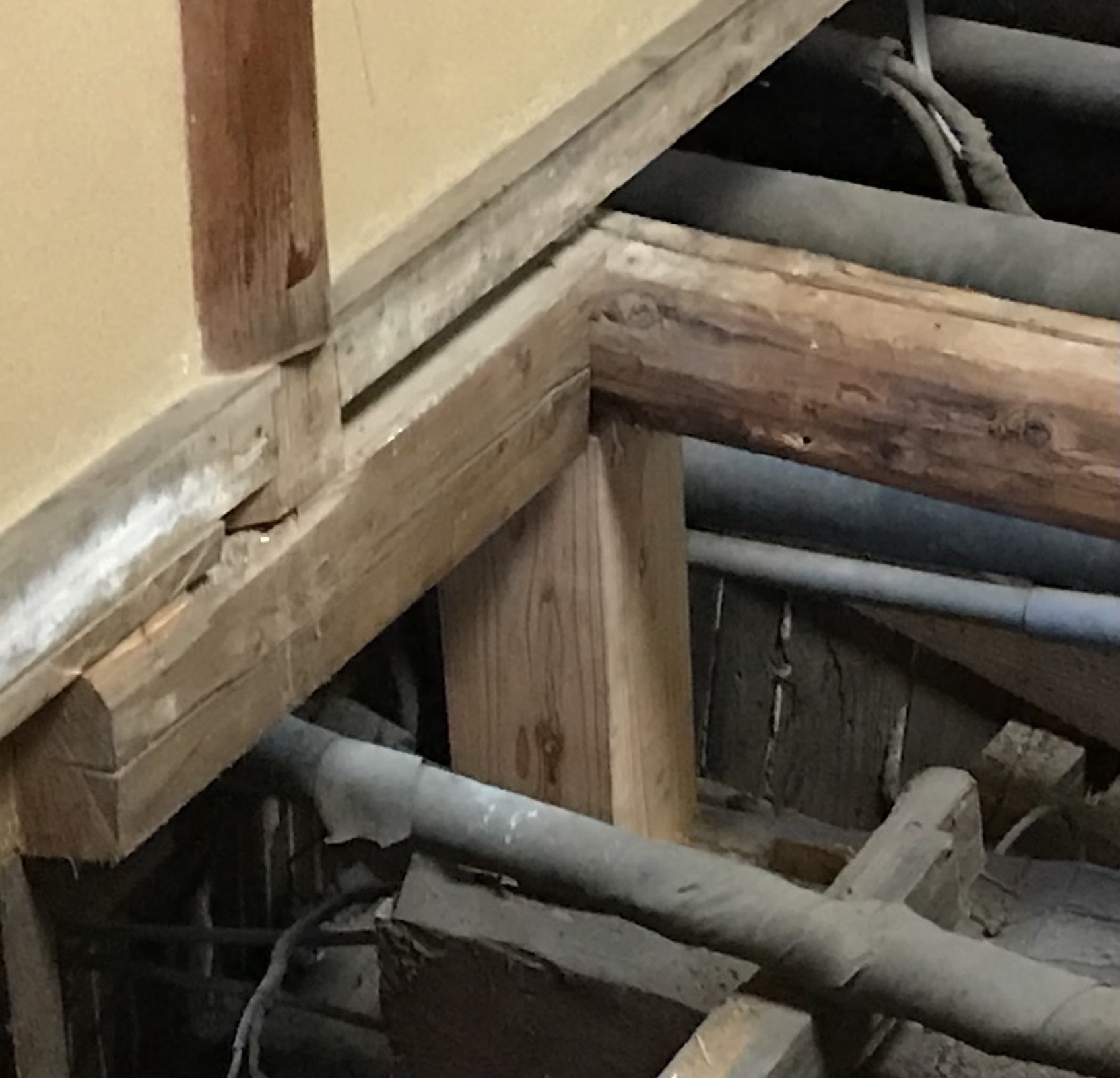 桜三階と仲三階の配管撤去が終わり、本日は仲三階の床の補強工事を行っております。
