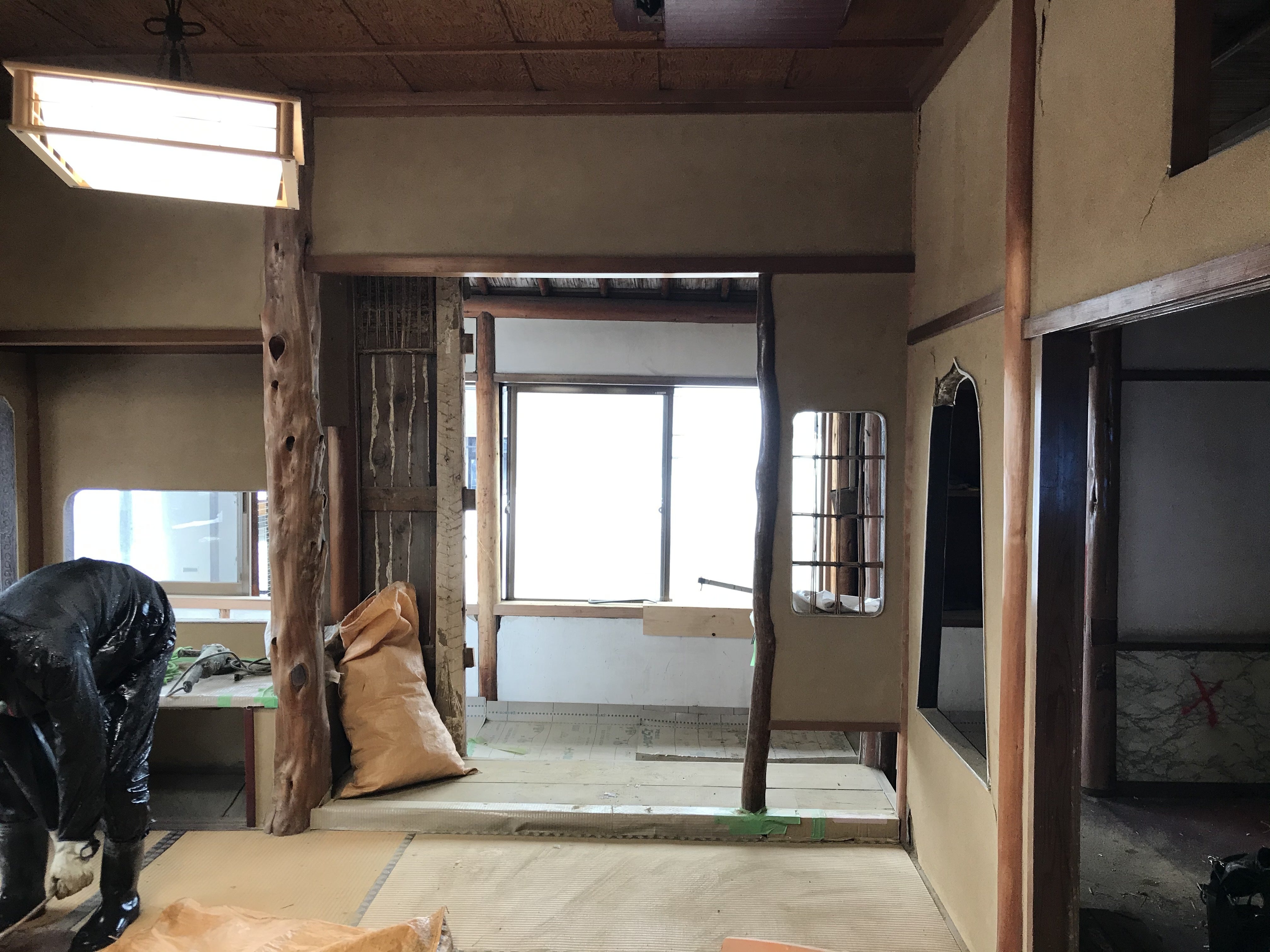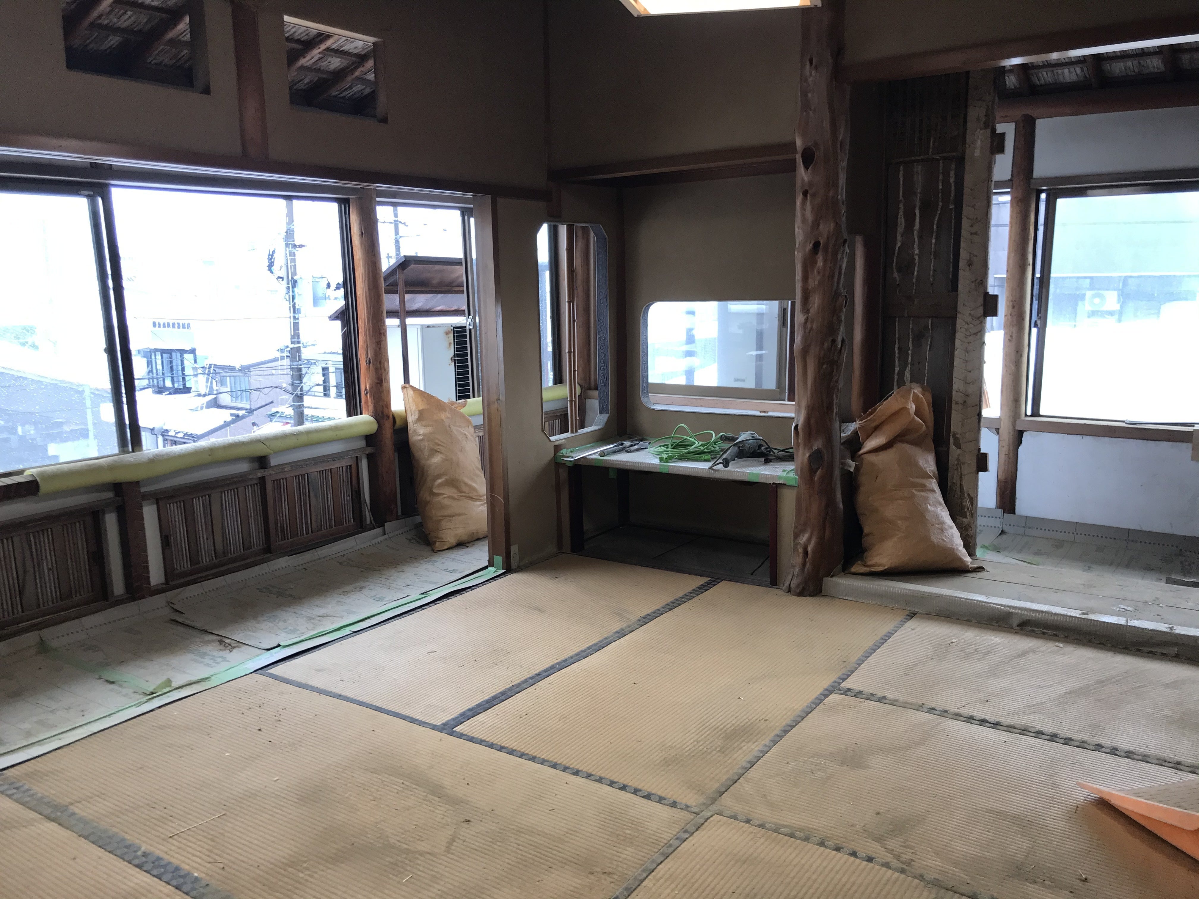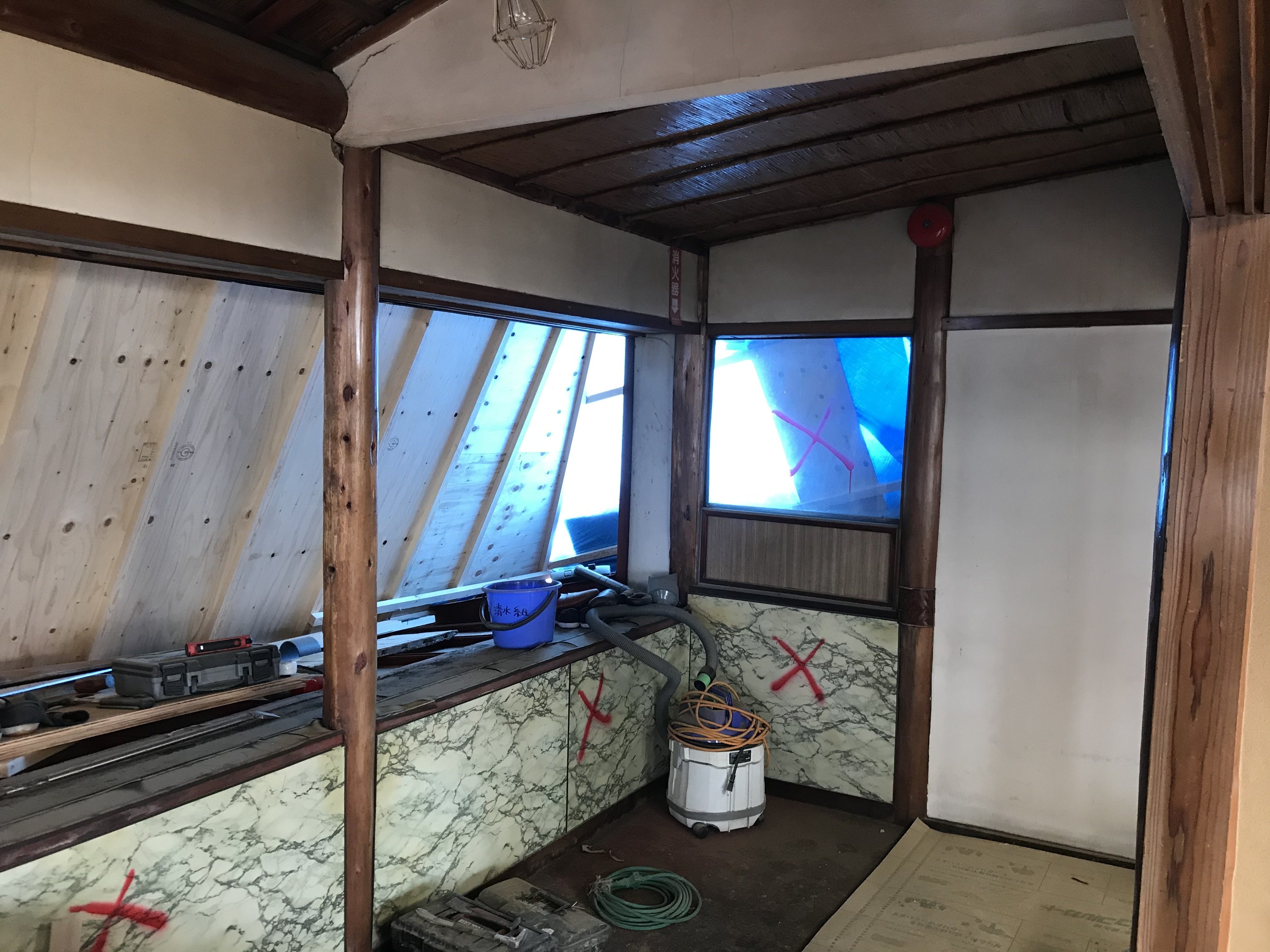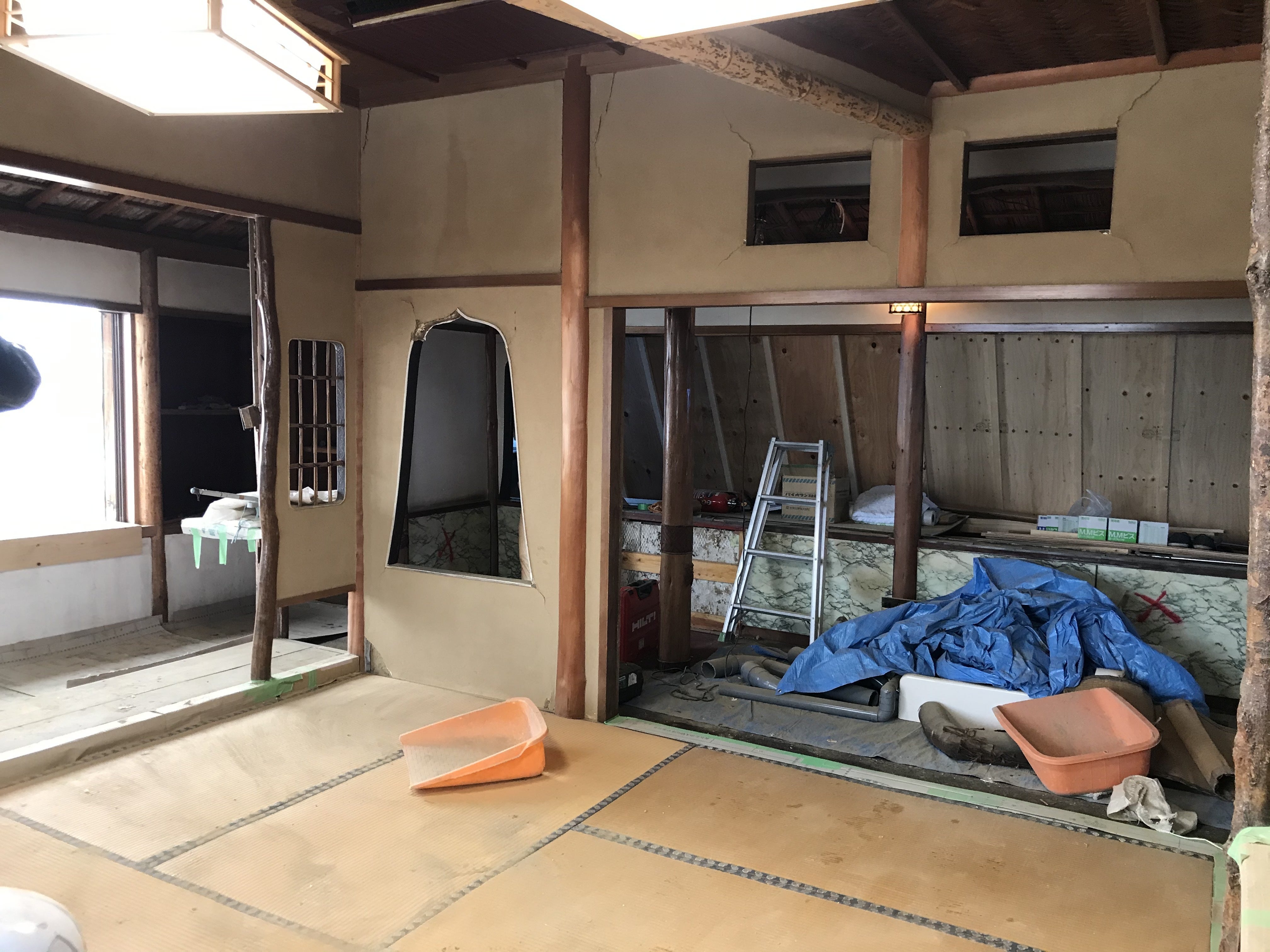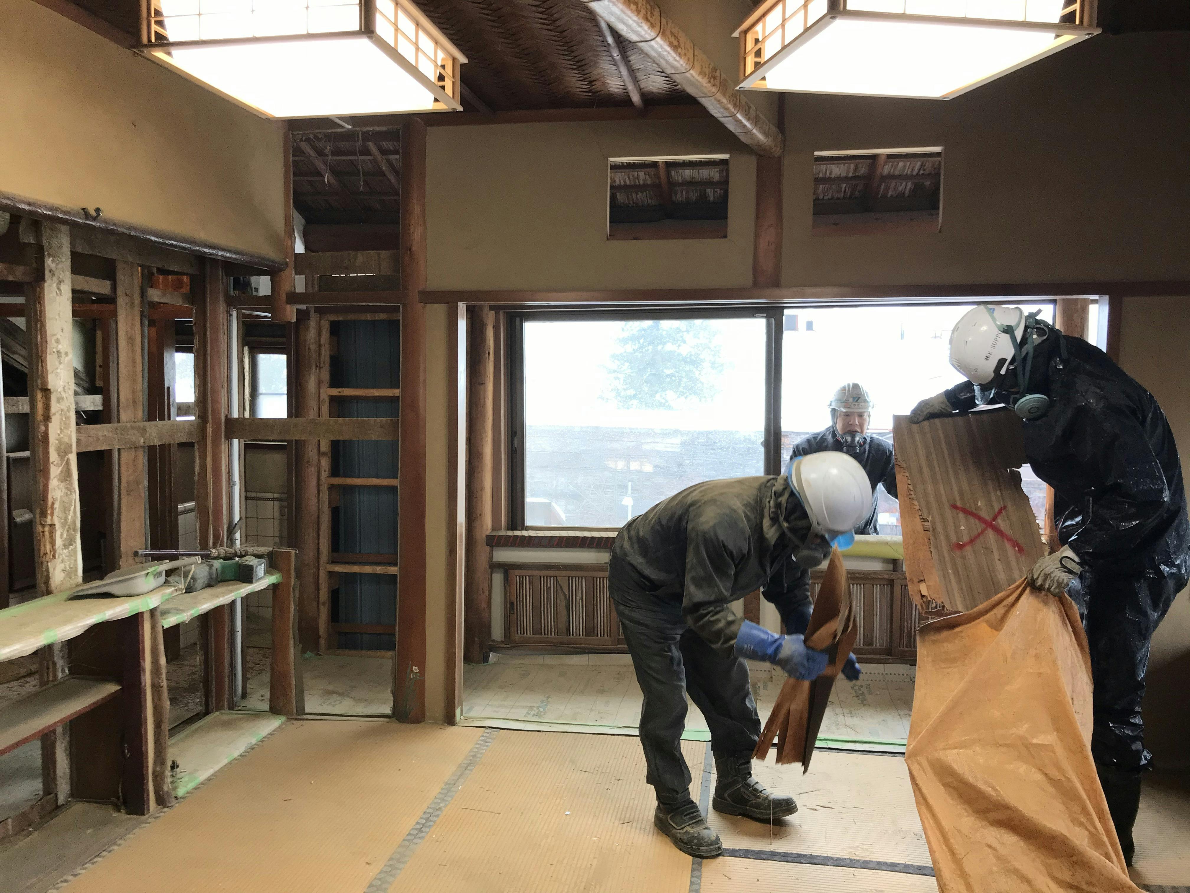 豪雪の影響で遅れていた「妙高の間」の改修工事が着工しました。今後、解体作業から始まり、床・壁の耐震補強工事、トイレ修繕、内装工事を行い3月20日前後には終了する予定です。