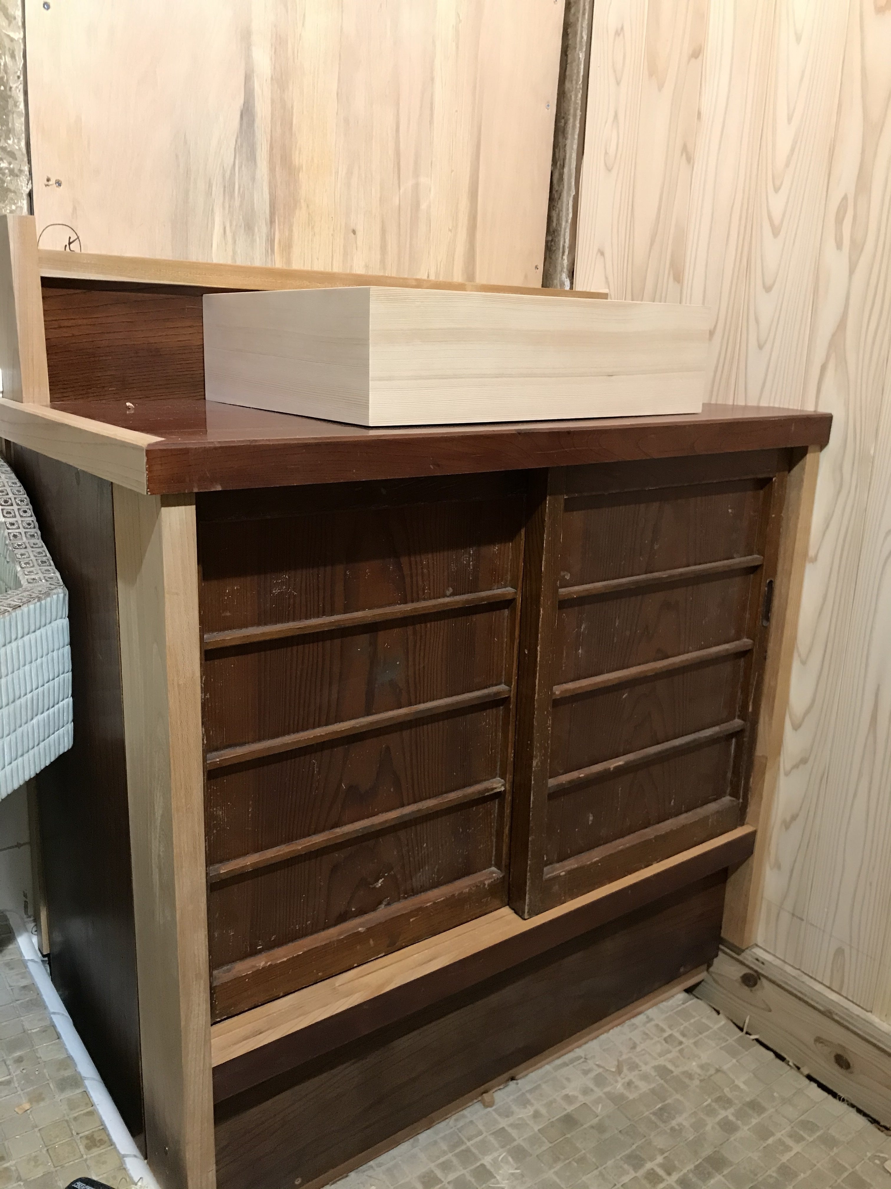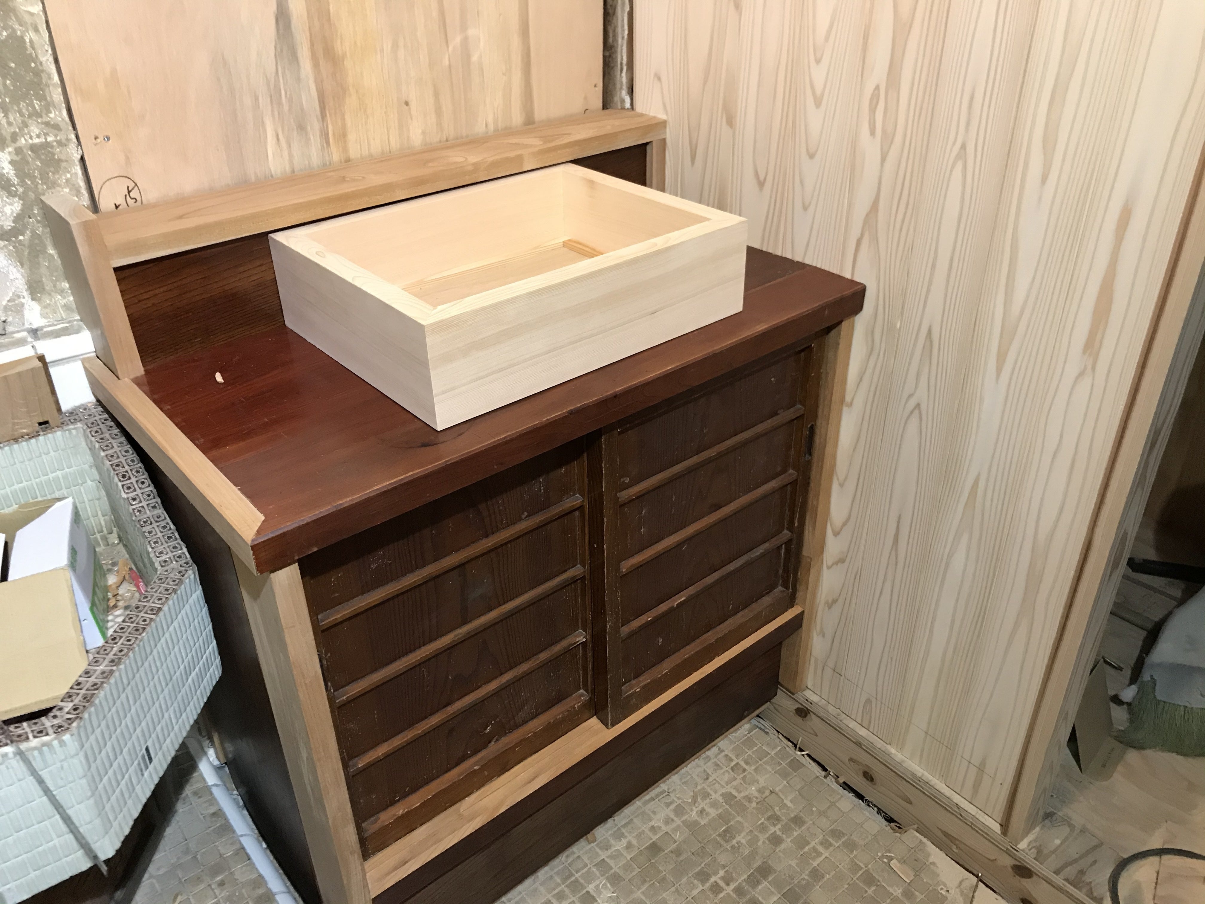 洗面台の天板と扉は古いものを再利用しております。