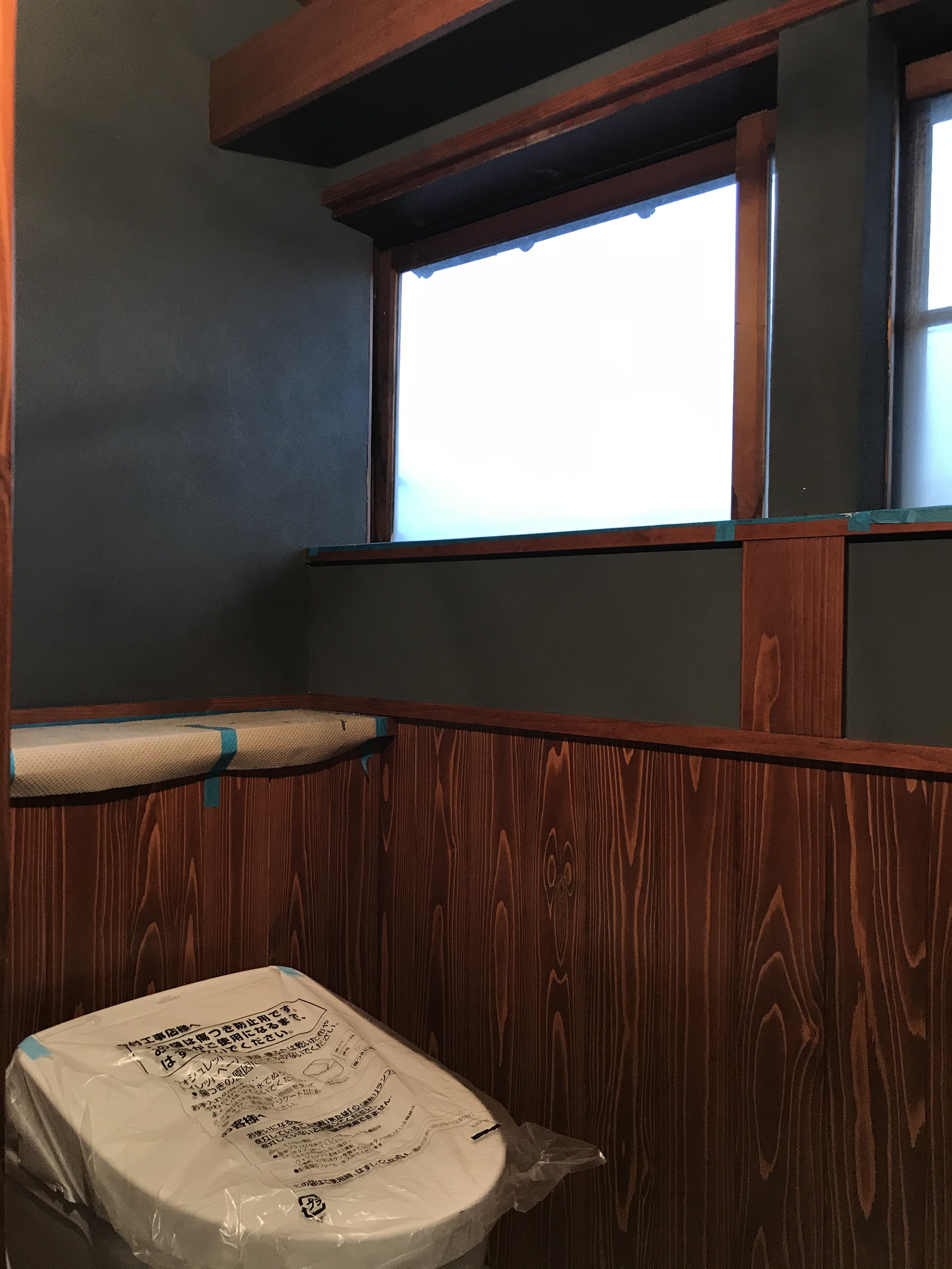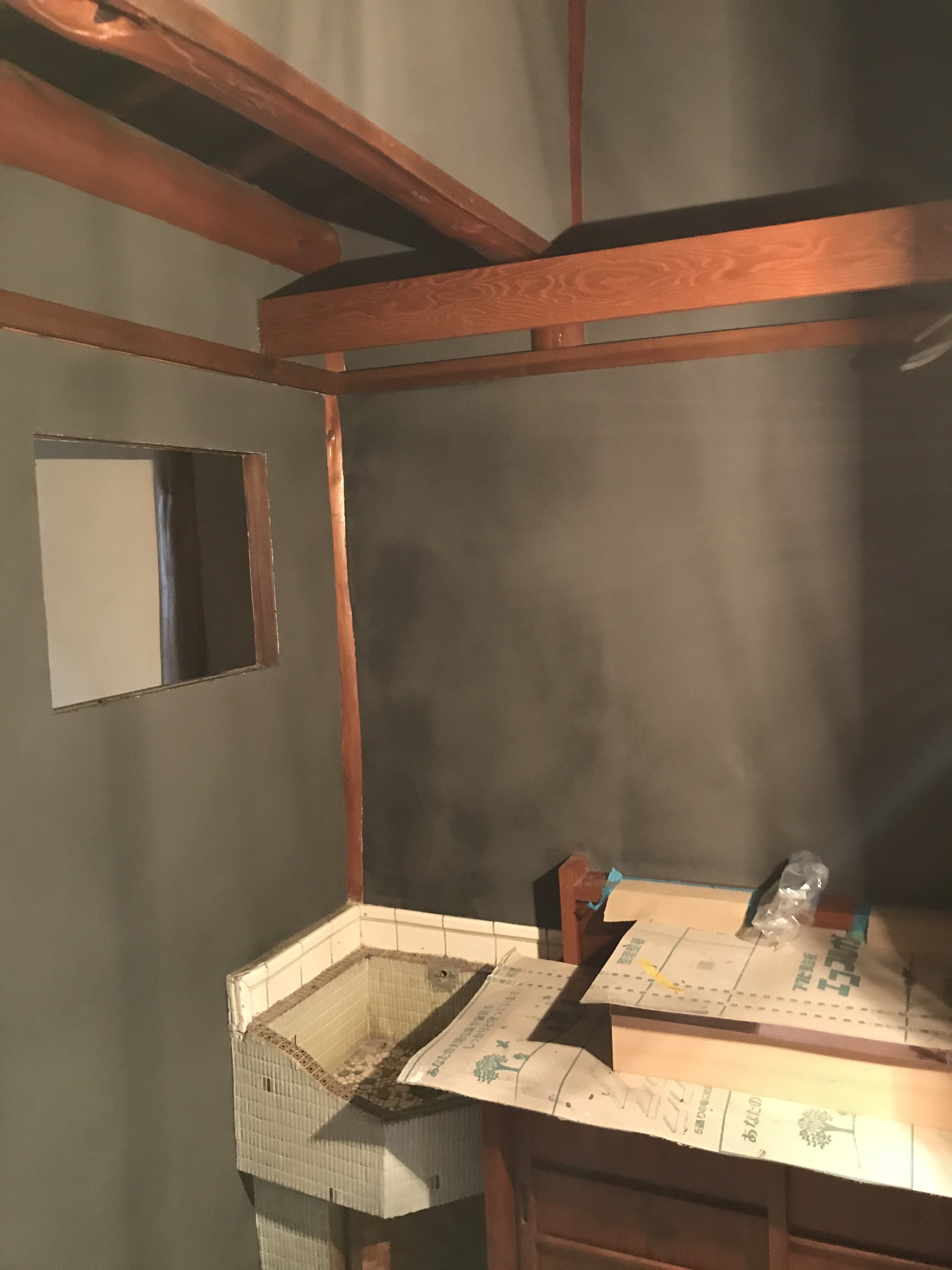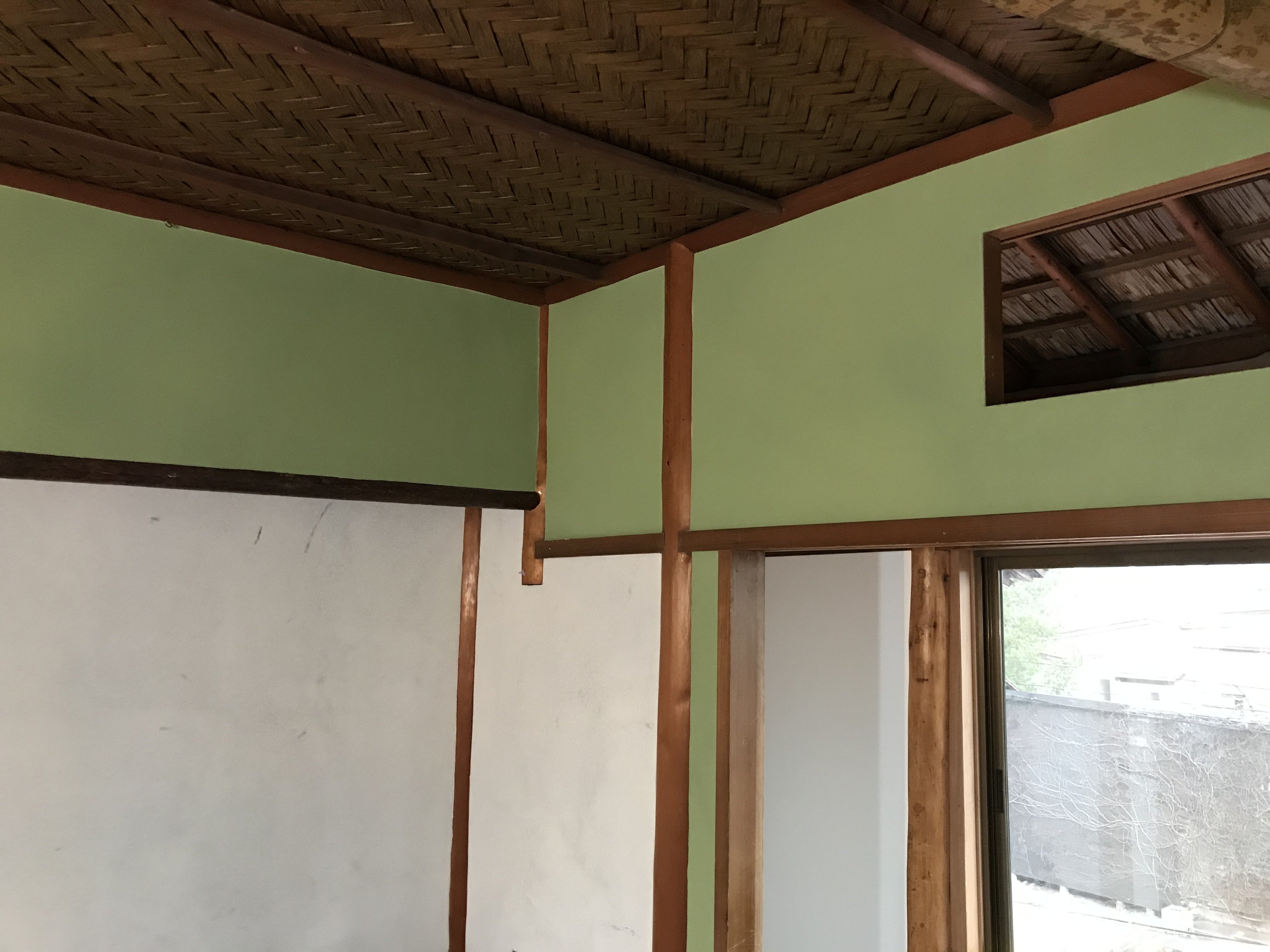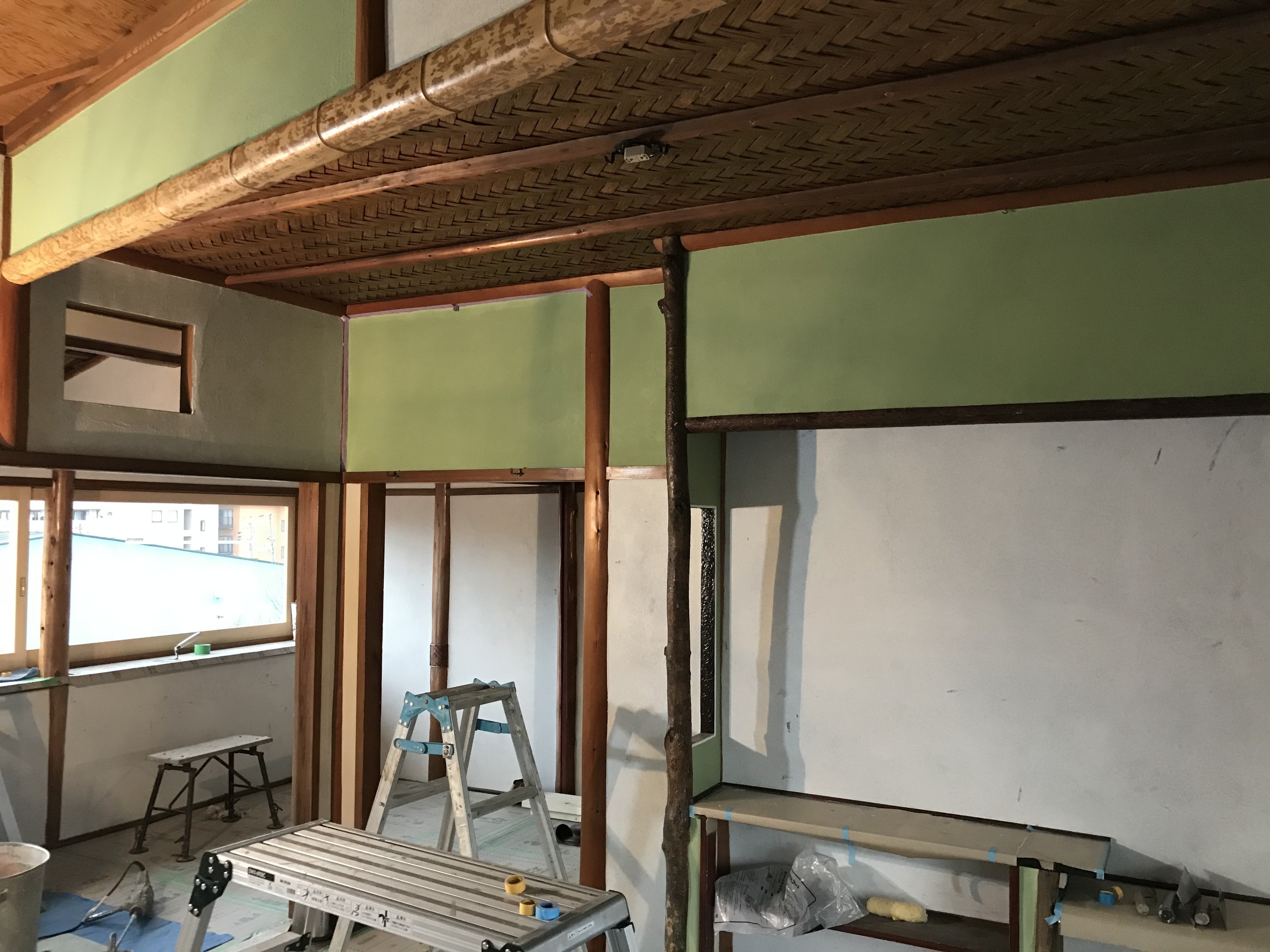 いよいよ壁の仕上げに入り抹茶色に生まれ変わりました。乾燥するともう少し薄い色になるようです。