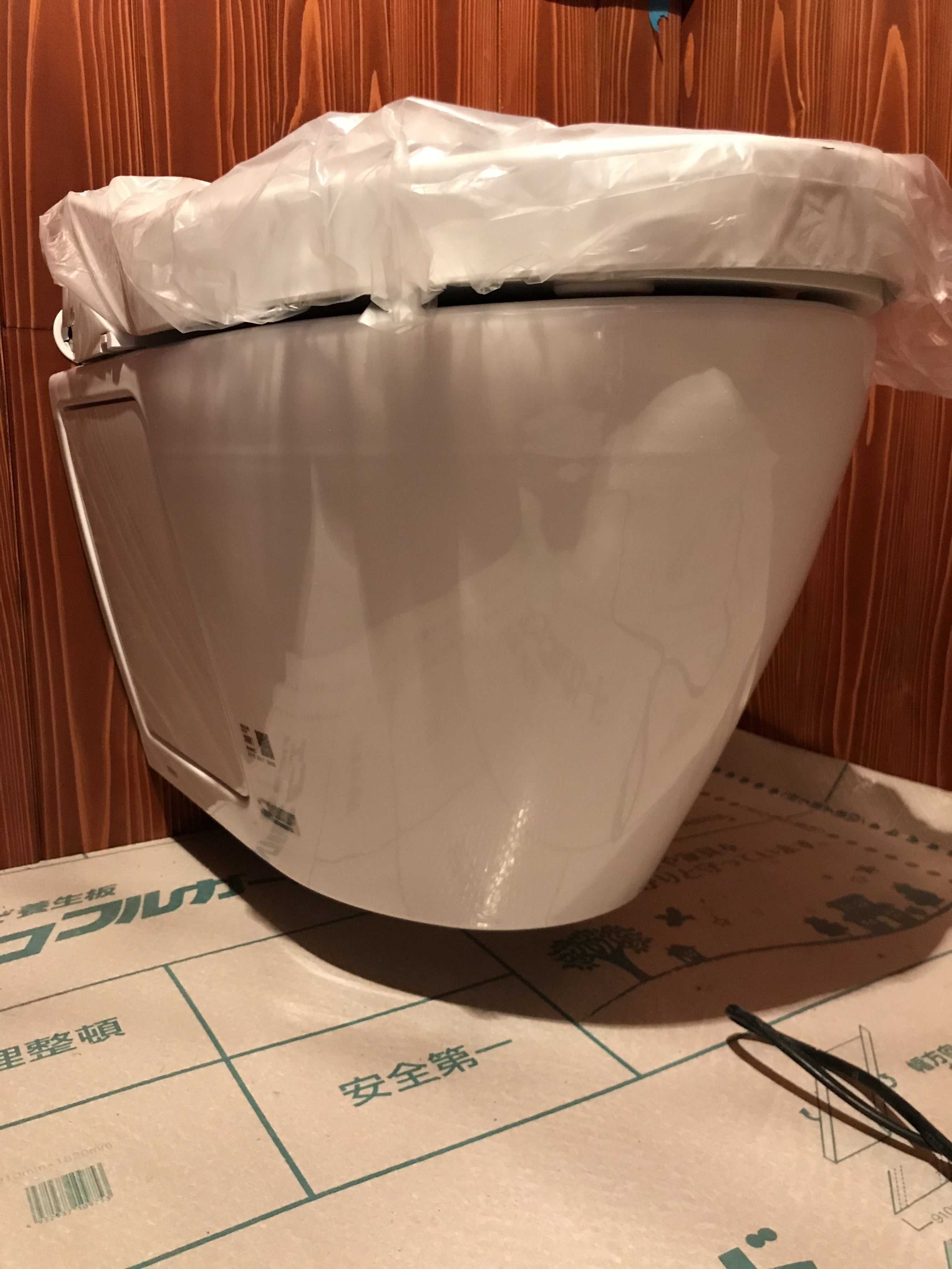 便器は今年の2月に出たばかり新商品で壁の中に配管を入れて便器を固定しているので宙に浮いています。