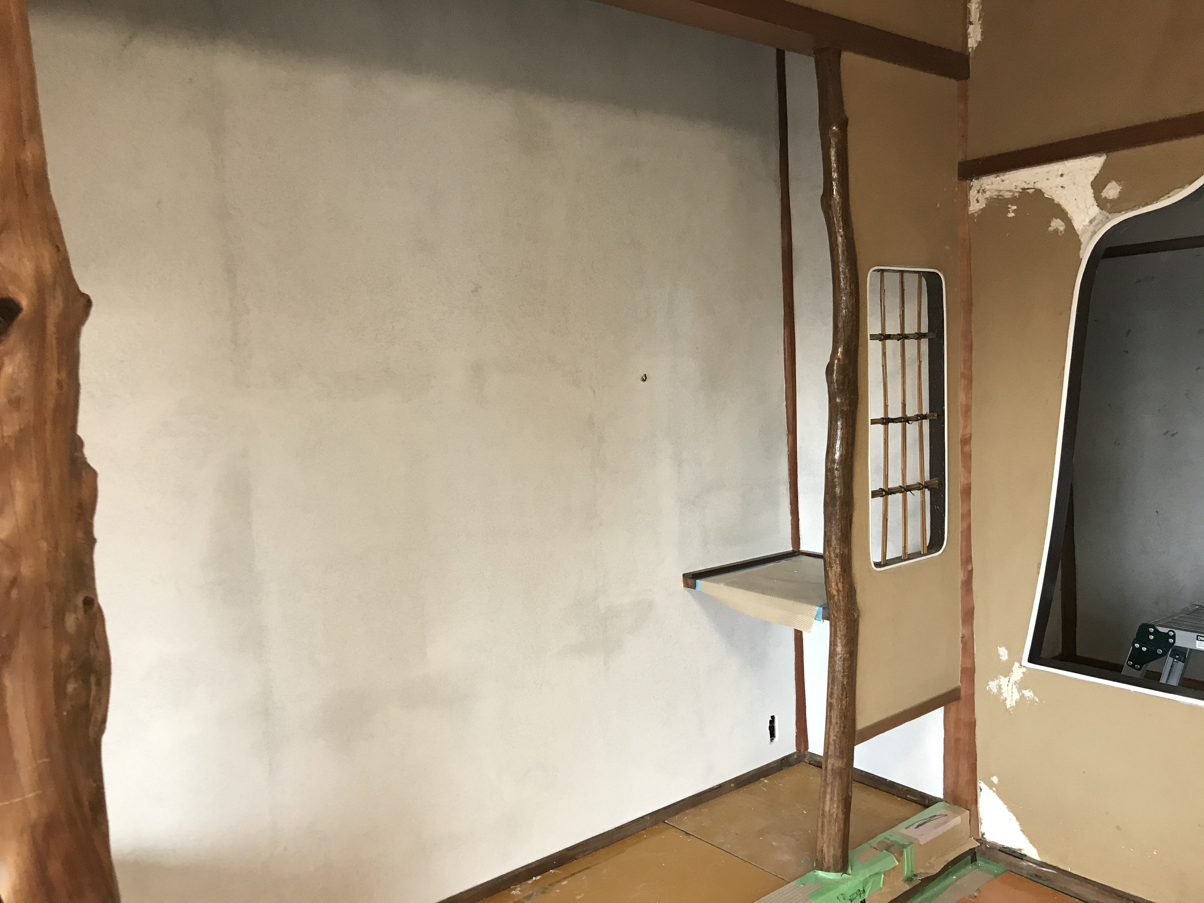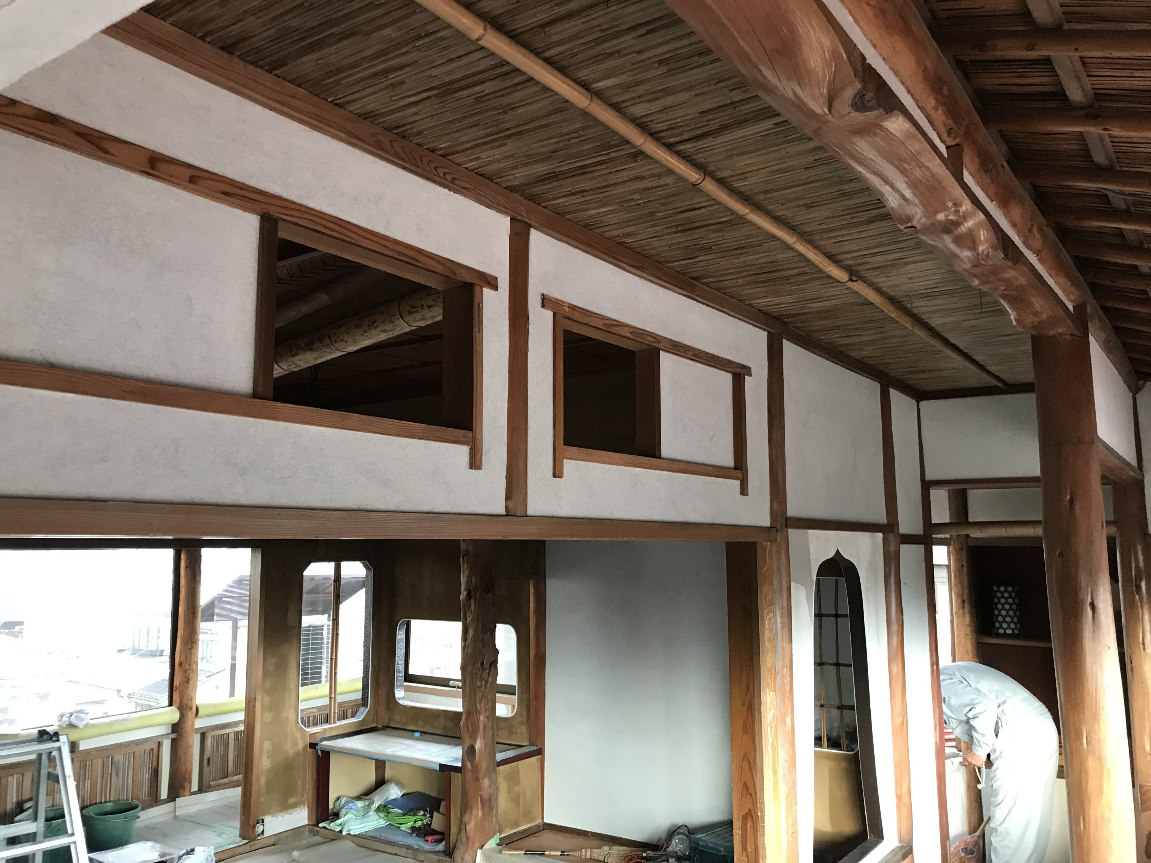 左官工事に入り壁の下地を塗っています。補修しながらの塗りになるので4~5日間かかるようです。