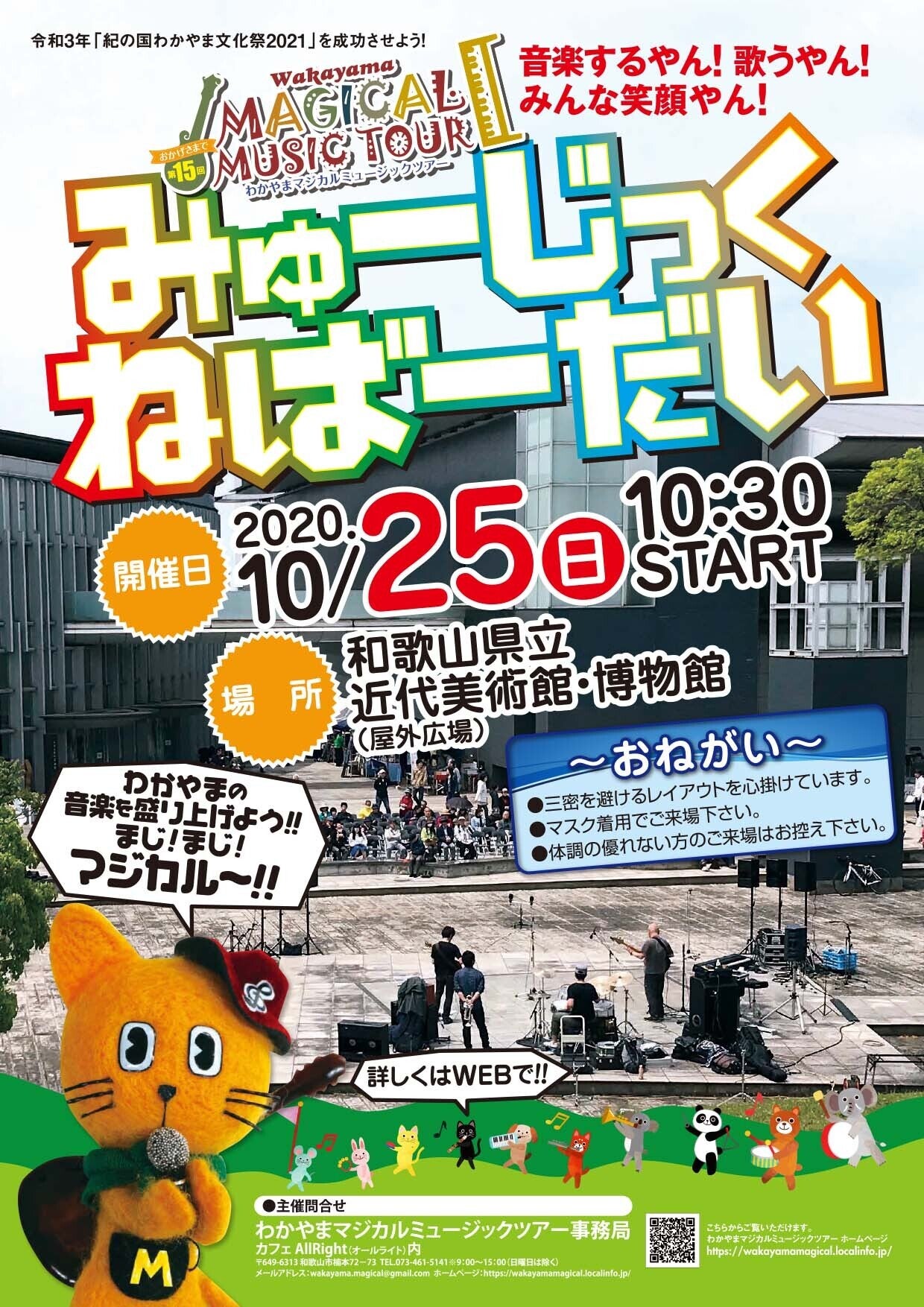 しかし、この自粛期間にマジカルミュージックツアーの 開催意義を考え、わかやまの音楽を盛り上げるためには、音楽を聴いてもらえる場所や、演奏する環境を守ることが大切ではないかと思い、『みゅーじっく・ねばーだい』と銘打って第15回わかやまマジカルミュージックツアー は、和歌山のライブハウスをはじめ、このイベントにご協力いただいている参加店様への支援を目的に開催することを決定しました。