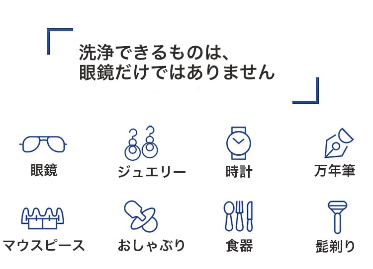 メガネとコンタクトだけでなく、ジュエリー・腕時計・化粧道具などの洗浄に幅広く対応。