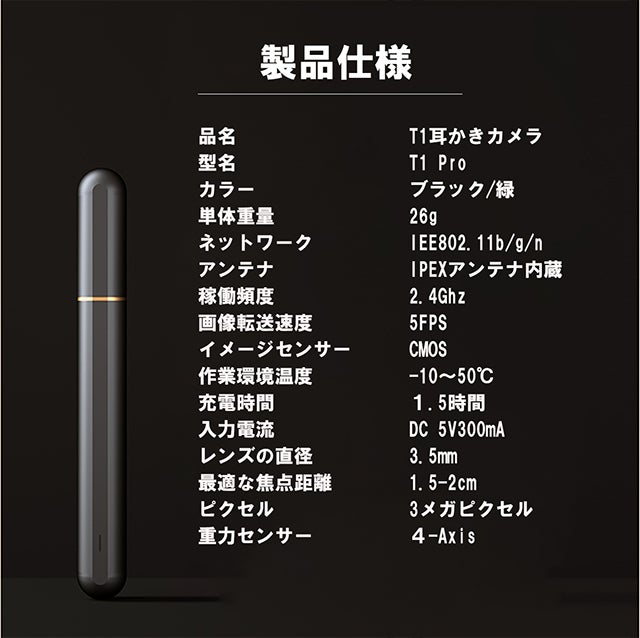 「T1」は直径わずか3.5mmのレンズが搭載されており、300万画素の高画質カメラでリアルタイムに耳の中を映像に映し出すことができます。内蔵されているカメラは超小型サイズなので、お子様から大人までの耳にもしっかり対応できます。