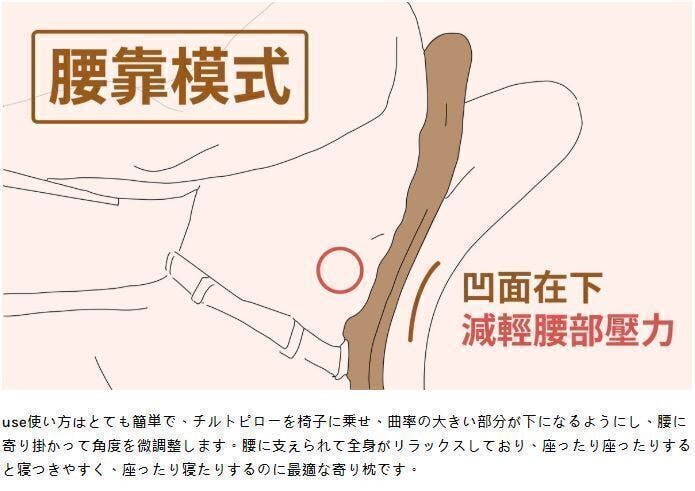 使用方法:「チルトピロー」をイスに乗せ、曲率の大きい部分を下にして腰にあて、寄り掛かって角度を調整します。