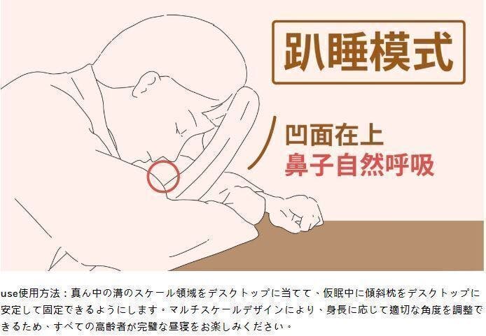 使用方法:凹面を上にして使用します。7つの滑り止めで「チルトピロー」をデスクに固定します。マルチスケールデザインにより、身長に応じて適切な角度に調整できます。鼻と「チルトピロー」の間に隙間を作ることで、快適に呼吸ができます。