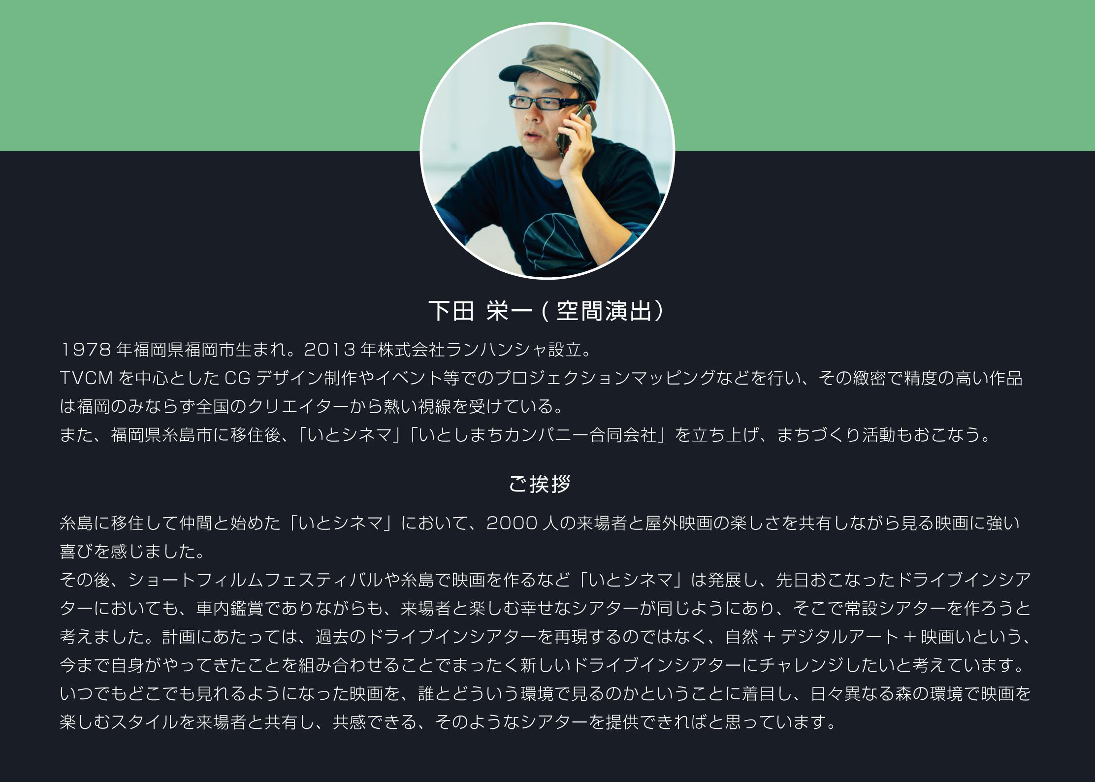 「いとシネマ」は社会活動の一環としていとしまのメンバーと行ってきましたが、今回のプロジェクトはいとシネマとはまた別に、私が営んでいる会社が主体となり運営をいたします。 弊社や自分自身のテーマである、 “まだみたことないもの” 人々に夢を与えられるようなもの”を造ることができる可能性があるのではないかと、初めてプロジェクションマッピングに挑戦した時と同じようなワクワク感を感じています。もちろんコロナに配慮した安心して観られるシアターになるよう頑張りたいと考えております。