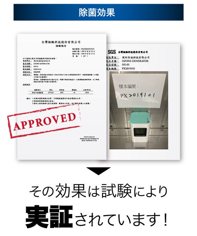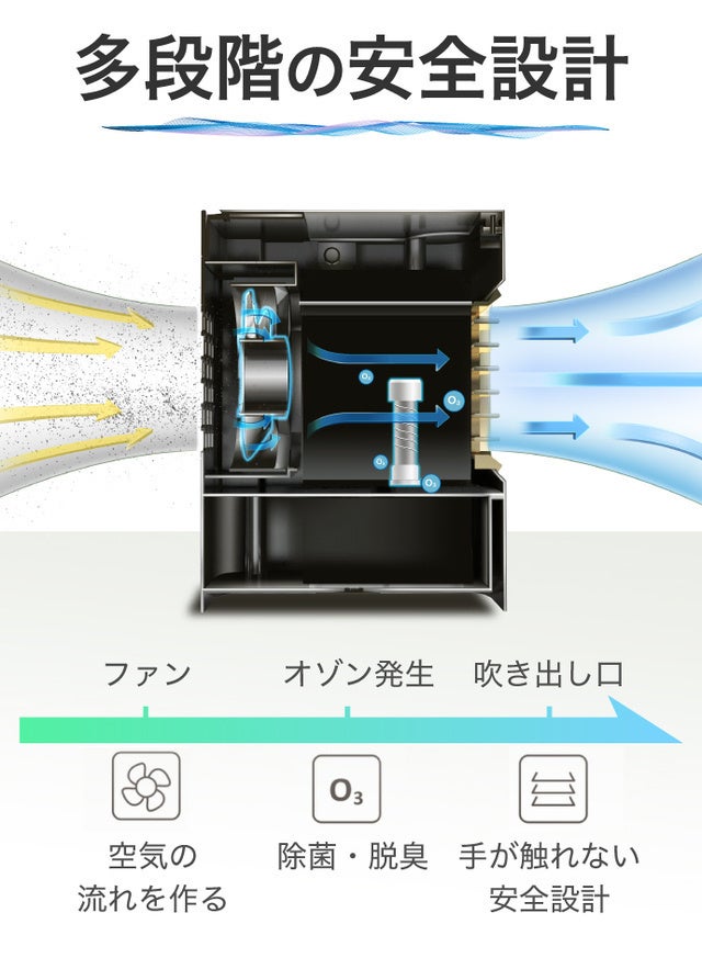 オゾンの力で細菌などを空間全体で除菌していきます。これがオゾン発生器の実力です。また、本製品に入ってきた細菌や匂いの成分を発生させたオゾンが取り囲み除菌します。