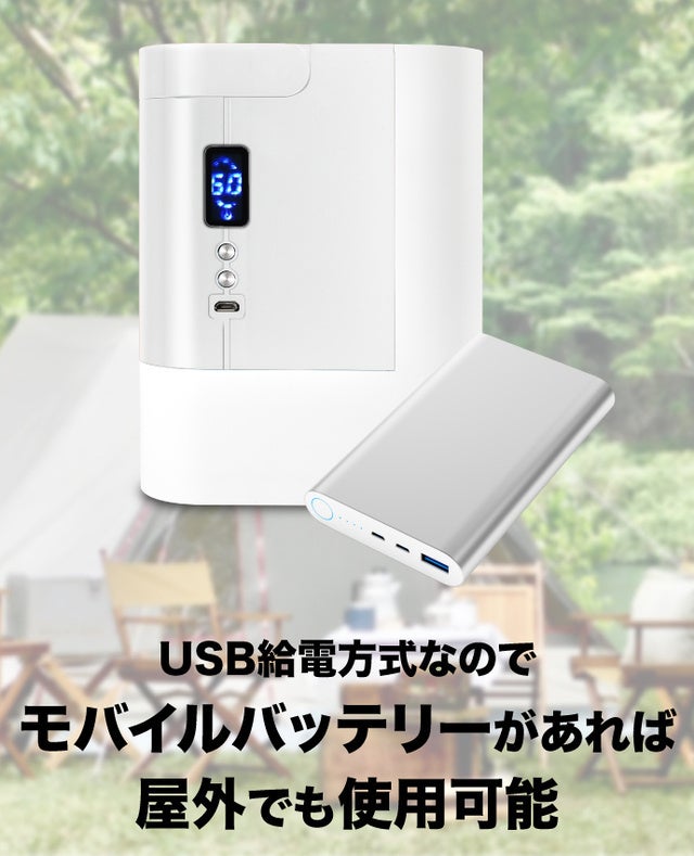 USBケーブルでの給電なので、モバイルバッテリーがあればどこへでも持っていけます。小型であるメリットが引き出せるこの製品ならではのポイントです。