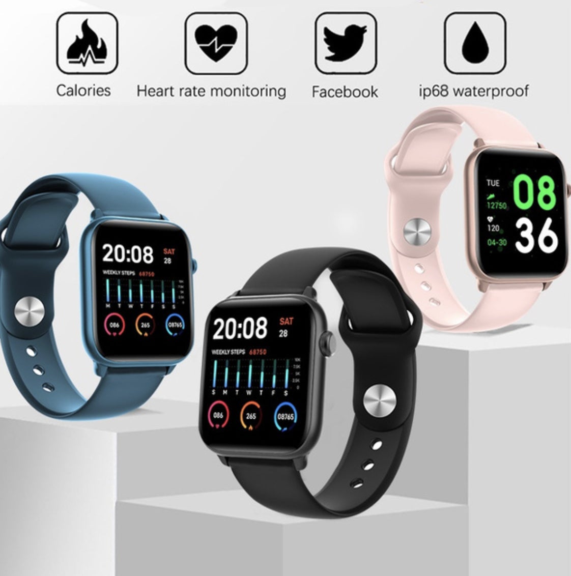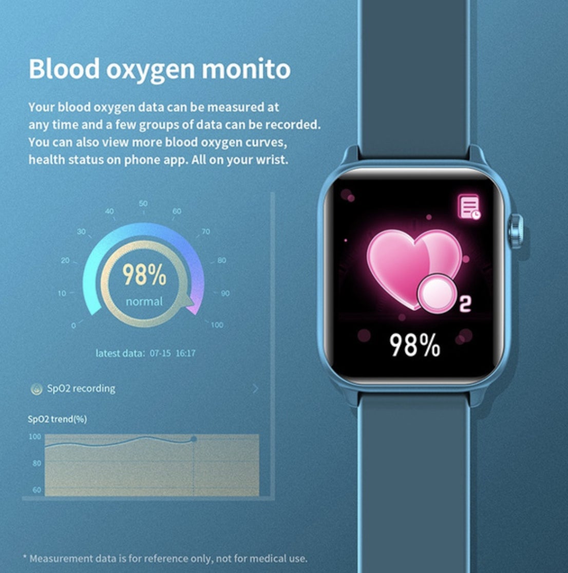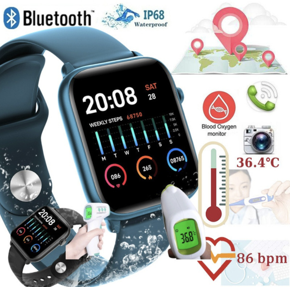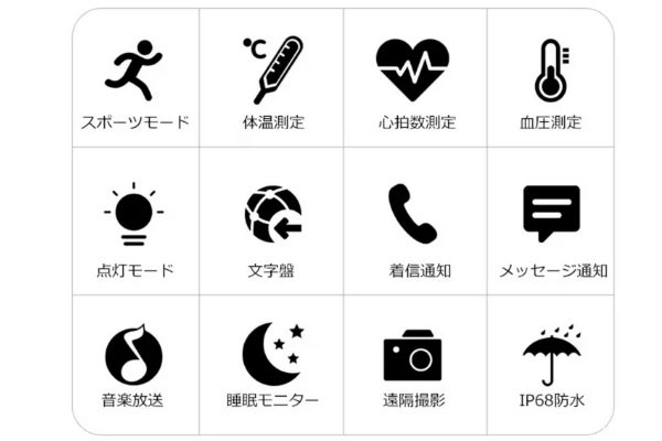 本製品は、温度管理や睡眠管理、血圧・心拍数測定・音楽再生機能など、多彩な性能を持ち合わせたヘルスウォッチです。