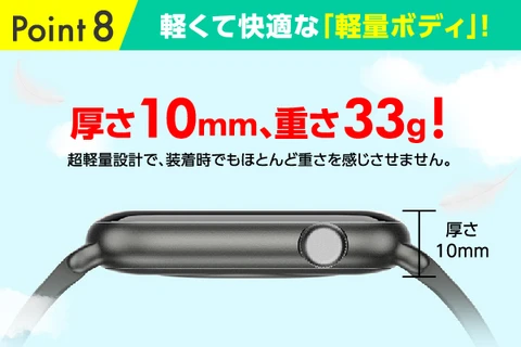 スマートウォッチは重いイメージがありますが、ヘルスウォッチは厚さ10mm、重さ33gの軽量設計で、つけている時にほとんど重さを感じることはありません。