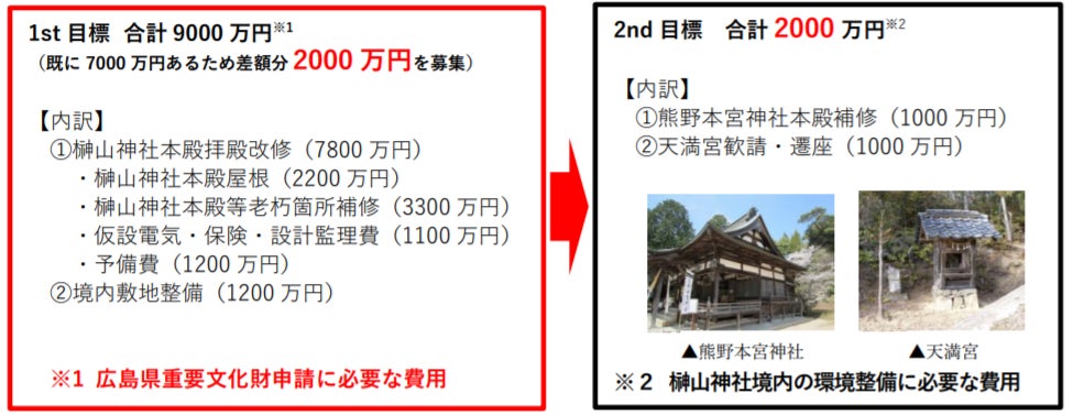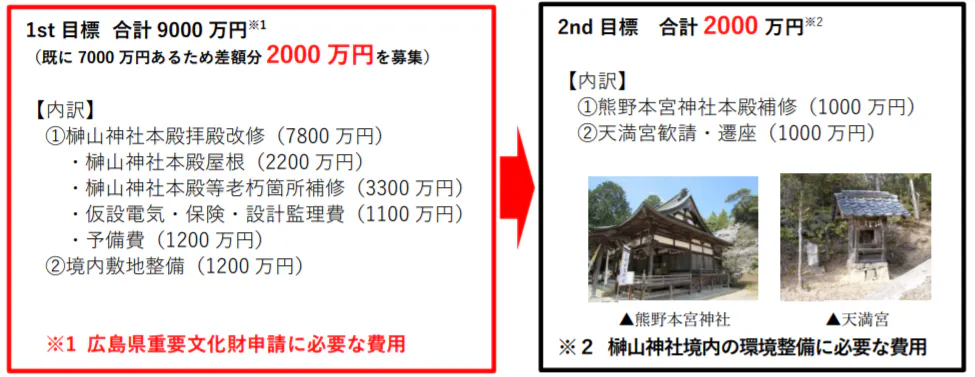 しかし、この金額も頭打ちで限界が見えてきています。そこで、これまでの「地域内で寄付を募る」という方法だけに止まらず、榊山神社として初めてクラウドファンディングに挑戦することにしました。まずクラウドファンディングでは、早急な整備が必要な箇所の修繕を完了させるために必要な2000万円を目指します。