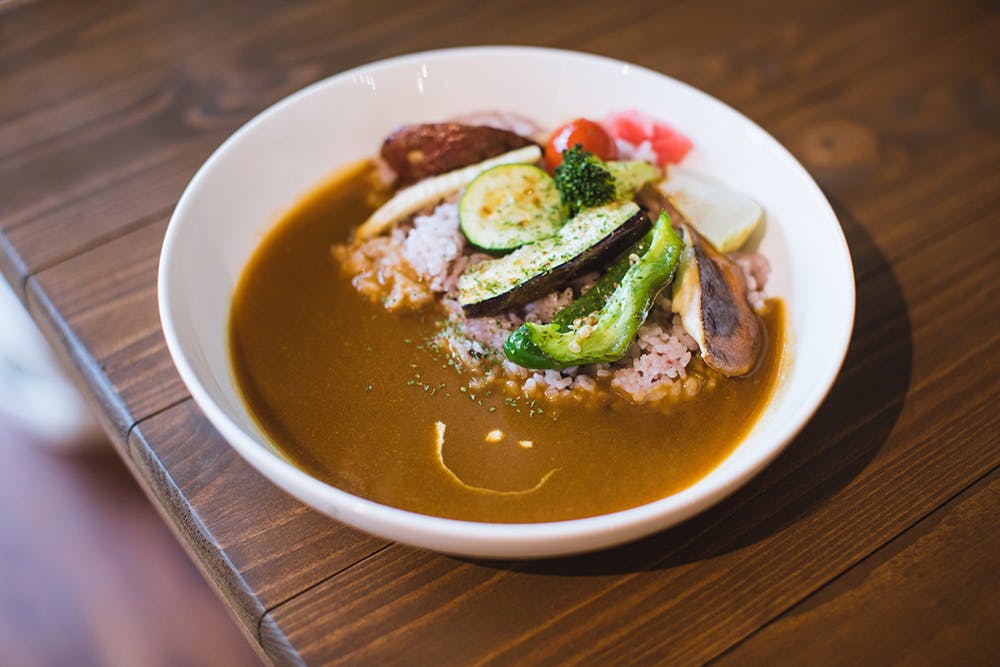 新富焼き野菜のスープカレー。ピーマンは栄養たっぷりの種はつけたままお出ししています!