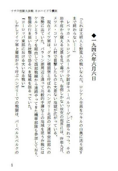 今回は当サークルが2020年冬に発表を予定している全年齢向け小説同人誌『ナチス怪獣大決戦 ネロハイドラ襲来(仮)』の各種費用820,925円をご支援頂けないかと思い、クラウドファンディングの企画を立ち上げました。