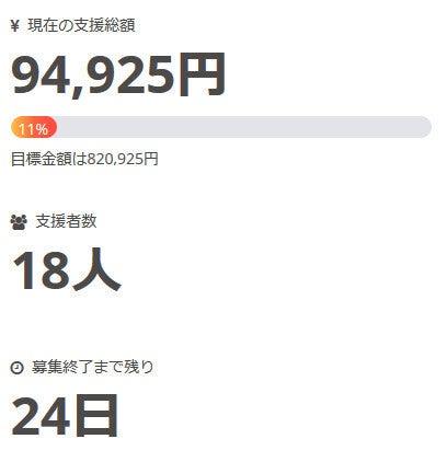 現在の調達率は11%、パトロン様は18名となっております。