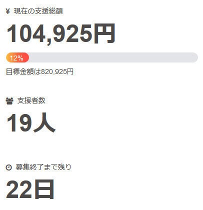 現在の調達率は12%、パトロン様は19名となっております。