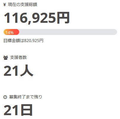 現在の調達率は14%、パトロン様は21名となっております。