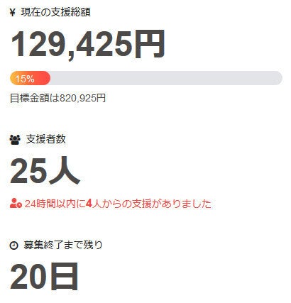現在の調達率は15%、パトロン様は25名となっております。