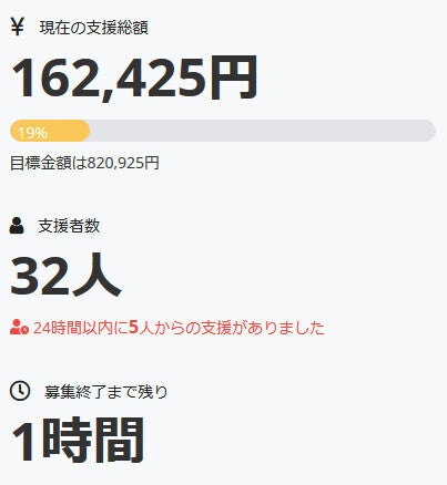 現在の調達率は19%、パトロン様は32名となっております。