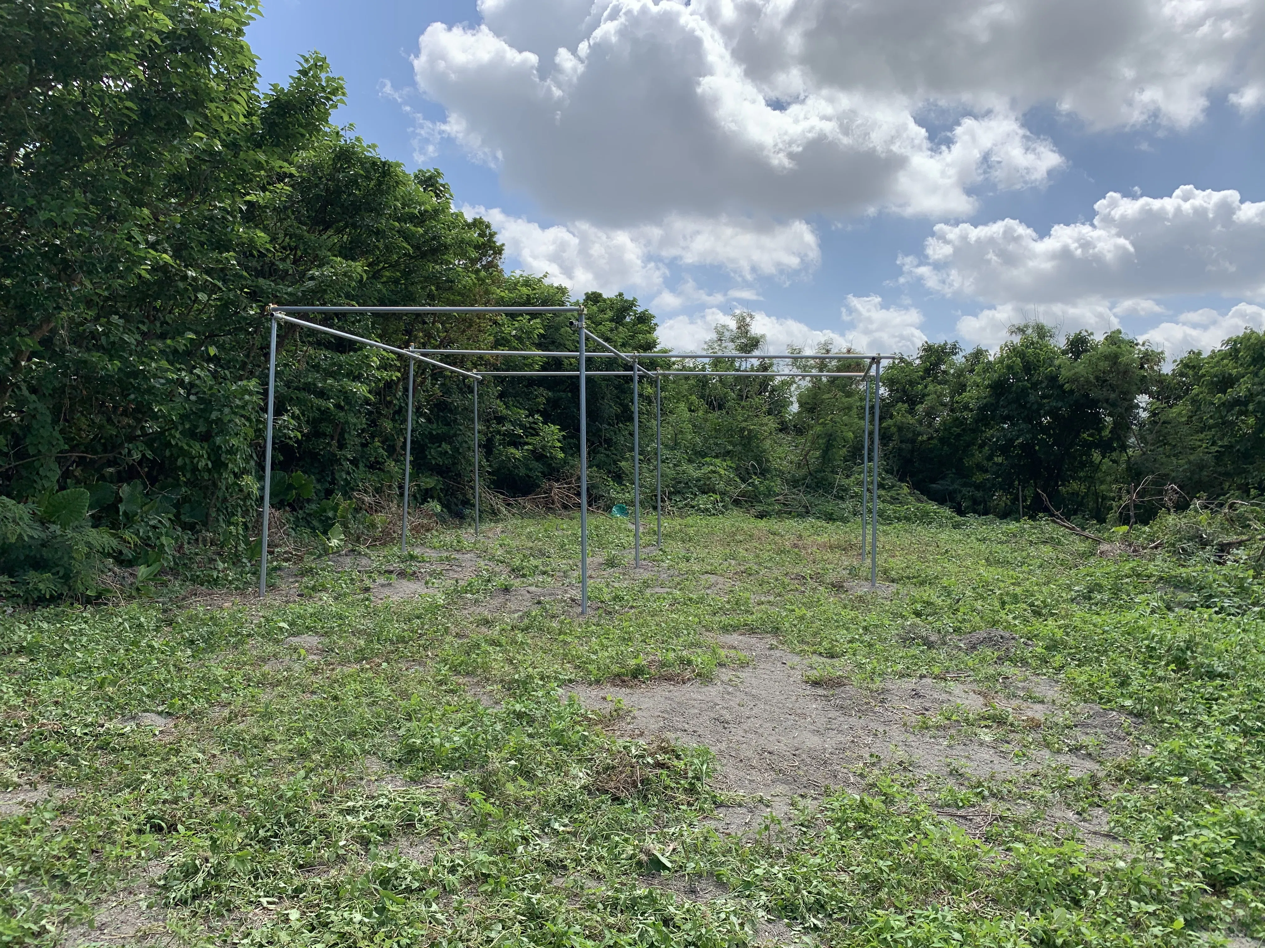 現在、写真のように単管パイプを立てて、大きめの野菜棚をつくっています。(野菜はつくらないよ!笑)