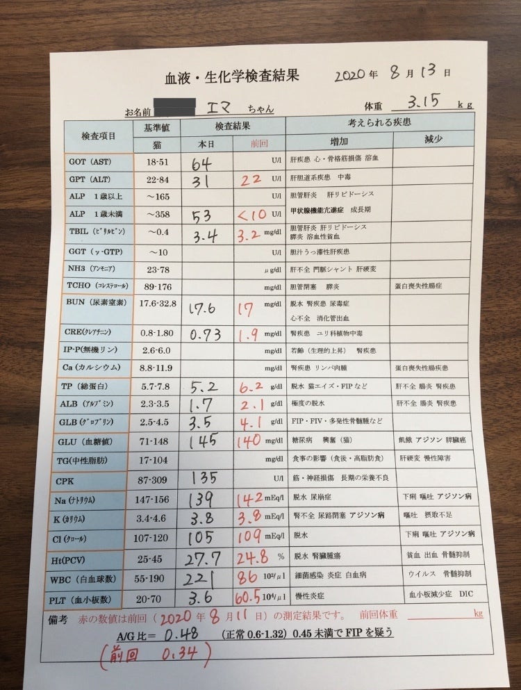 8月13日(協力病院初診)改めてエコー・血液検査等受けた結果、FIPウェットタイプと診断され投薬を開始しました。薬の量は体重*100mg/日、エマの場合は300mg/日が処方されました。