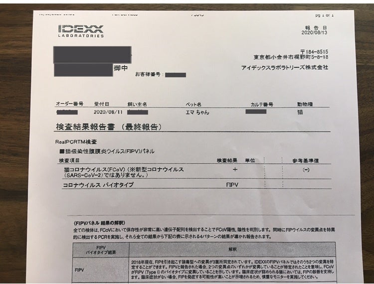 8月14日(PCR結果陽性)かかりつけ病院から検査に出していただいた腹水のPCR検査の結果、猫コロナウイルスの陽性(+)が出ました。