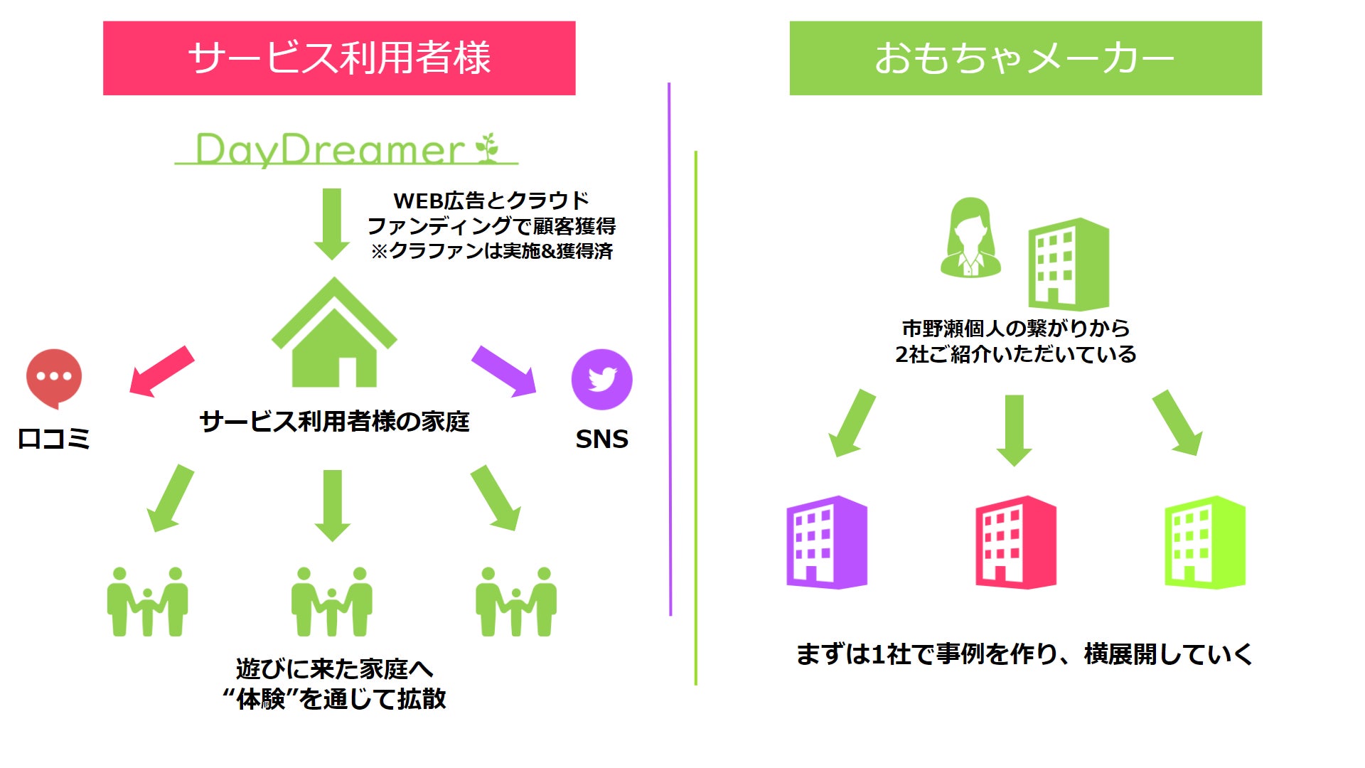 おもちゃメーカー様に関しては、市野瀬個人の繋がりからご紹介いただいているので、まずは1社様とお取引させていただき、そこから横展開を目指します!