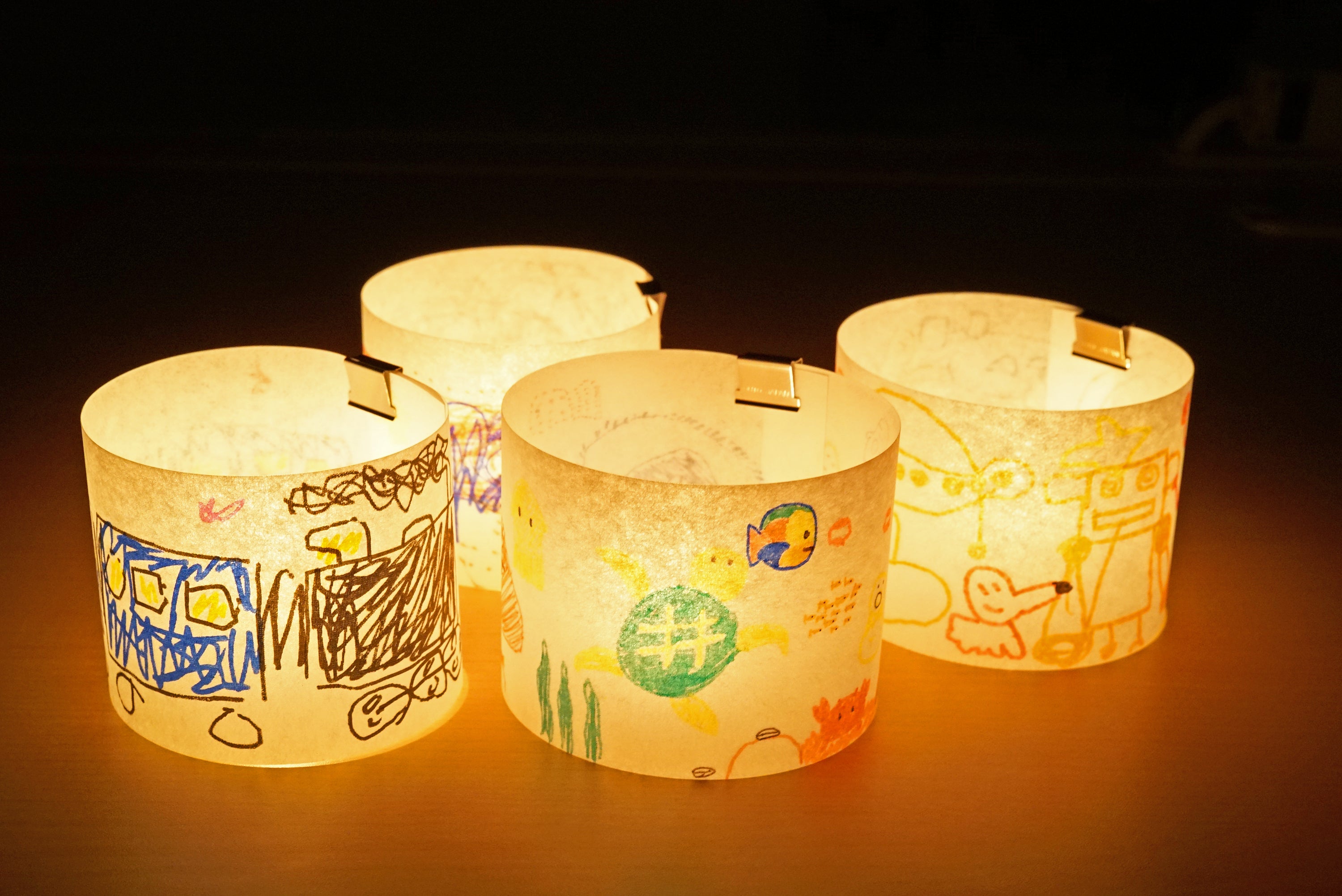 ろうそくセットを使用される場合は,不燃紙シェードに好きな絵,文字を描き,ろうそくにかぶせて写真を撮影してください。