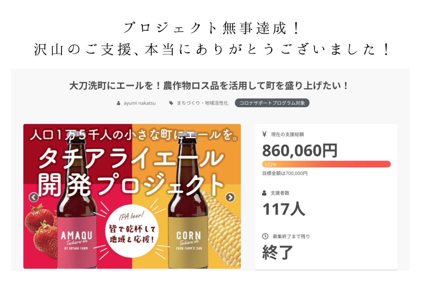 このプロジェクトは、2021/07/30に募集を開始し、 117人の支援により 860,060円の資金を集め、 2021/09/26に募集を終了しました