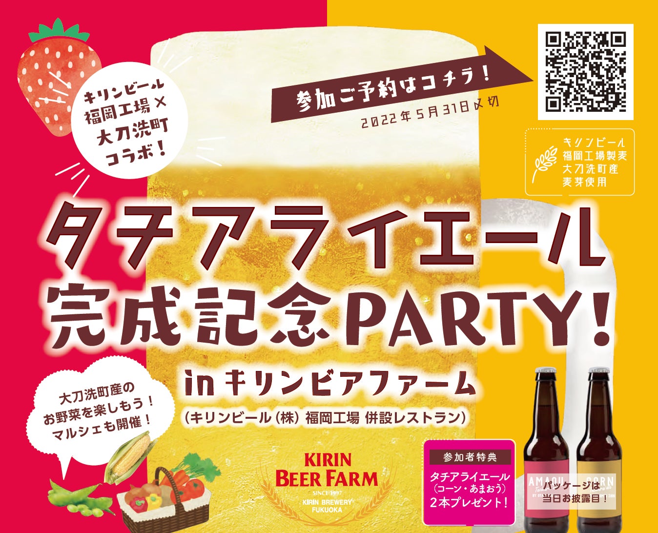 ご無沙汰しています!皆さんお元気でしょうか?ビールの美味しい暖かい季節になってきましたね〜〜〜〜!タチアライエールは、6月完成に向けて着々と準備が進んでおります!もう少しお待ちくださいね*そして、今回はご支援者の皆様に、大大大ニュース&イベントのお誘いです〜〜〜!!♪♪麦芽をご提供頂いた、キリンビール福岡工場さんとコラボ!!『タチアライエール完成記念PARTY! in キリンビファーム』開催が決定しました!! 完成したビールをこちらのイベントでいち早くお披露目&皆で乾杯〜〜!!そして、夏にぴったりの テラス de BBQ キリンビアファームの美味しいフードもご用意しております!!♪イベントはご予約優先で、ご参加頂けます!! ご家族や、ご友人、ビール好きなお仲間とお誘い合わせの上、ぜひぜひご参加ください!♪^^【イベント概要】日 時: 6月11日(土) 12:00〜開始(11:30受付)会 場: キリンビアファーム(キリンビール福岡工場 併設レストラン) 福岡県朝倉市馬田3205-7(太刀洗駅から徒歩15分)料 金: お一人様 5,000円(税込)内 容: テラス de BBQ!フード + 飲み放題(一番搾り・ウーロン茶)+タチアライエール2本付(持帰も可)【ご予約フォーム】イベント参加は事前ご予約がおすすめです♪↓↓↓↓↓↓↓↓↓↓↓https://docs.google.com/forms/d/e/1FAIpQLSeZAoZbrbxp9U-M05KzvVHsOvfBiVwrHZf0T4zvxdcgxVzpOA/viewform当日は大刀洗町のさくら市場のマルシェも出店予定です!新鮮な町のお野菜販売等も行いますので、ぜひ会場へお気軽にお立ち寄りくださいね^^それでは会場で一緒に、完成をお祝いして乾杯しましょう!!!!皆さまにお会いできる事を楽しみに、ご参加お待ちしております〜〜〜〜〜〜♪♪^^!!